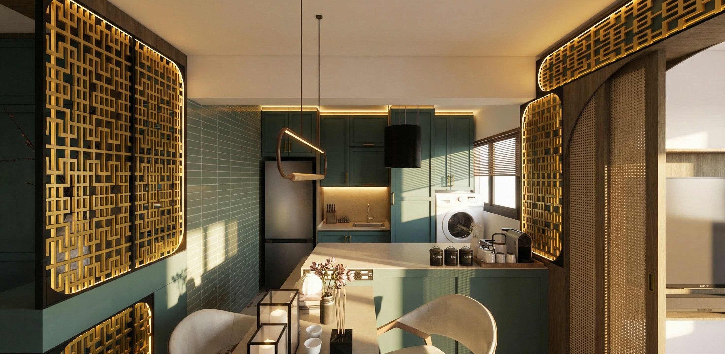 add warm led lighting to bottom of top kitchen cabinet above the sink add warm led lighting to the pendent light add warm led cove lights above the decorative panel on the right side of picture all decorative wall panels are in satin gold frame is in black with black curve at 4 corners add in afternoon sun coming from the window on the right beam is white in color woven finish on the sliding door does not see through it is opaque remember that wall on the left of the fridge are green subway tiles laid horizontally walls except for the timber feature wall is in white add warm led lightings at the black perimeter of all the decorative wall panels