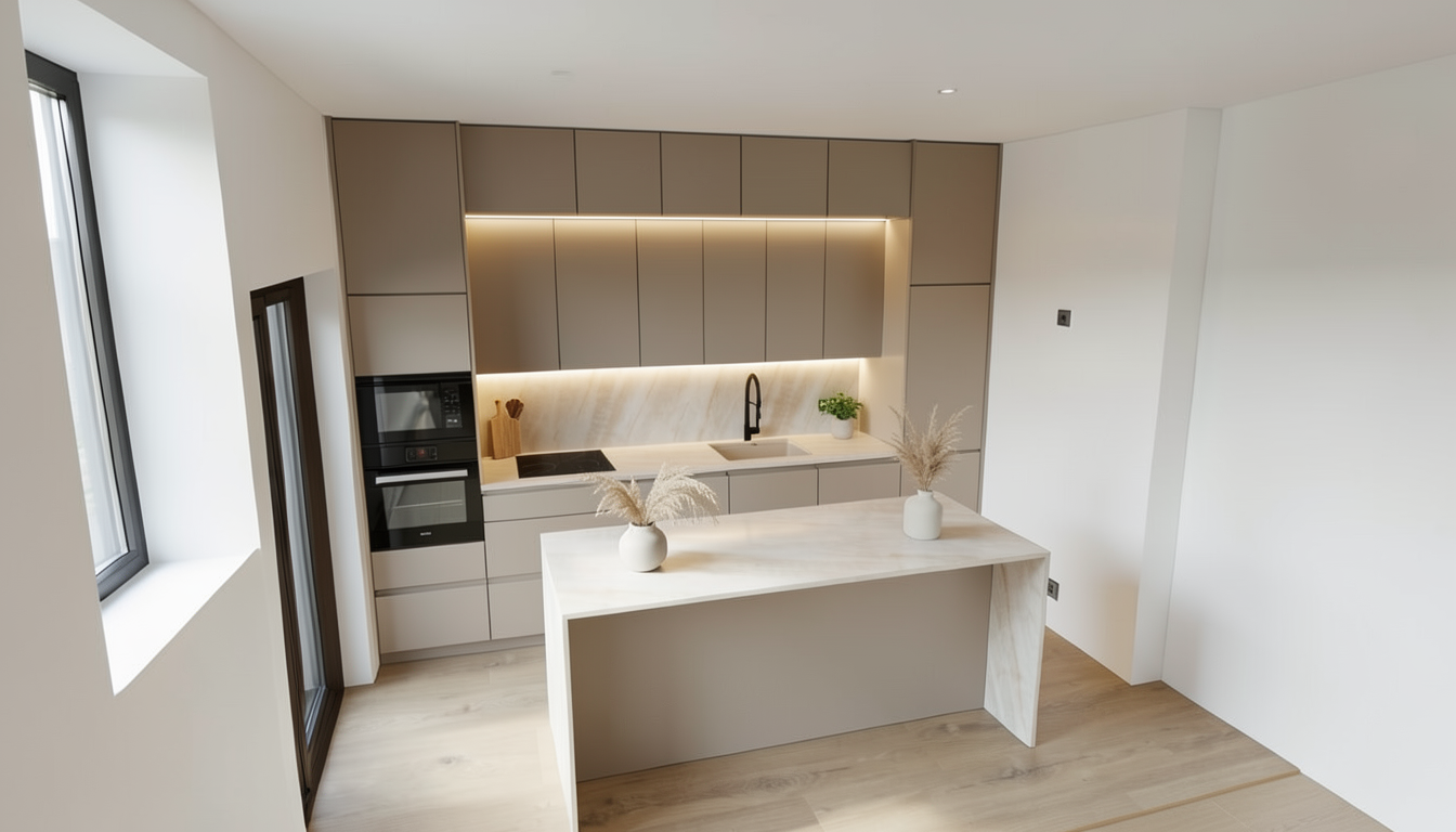 create ultra realistic images without changing any structure shape design or materials do not resize jpegs beige wood vinyl flooring off white walls beige wall panels add indirect light at shelf white bed