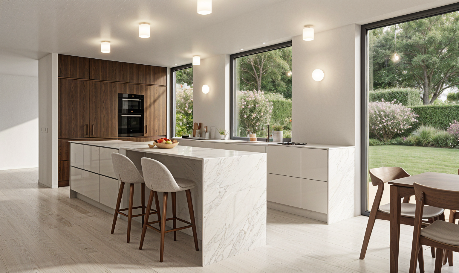 please create a pleasant interior leave the materials as they are in the photo only make the walls have a light texture the lights are glass matte almost opaque opal glass the floor is atlas concorde marvel travertine white cross tiles in the size 1200x600mm the view outside the windows shows a garden with bushes trees and lawn the light is pleasant and soft also turn on the lights inside the interior please add a few decorations in the kitchen coffee maker a bowl of fruit etc and also add two bar stools to the island bar that will match the style of the interior