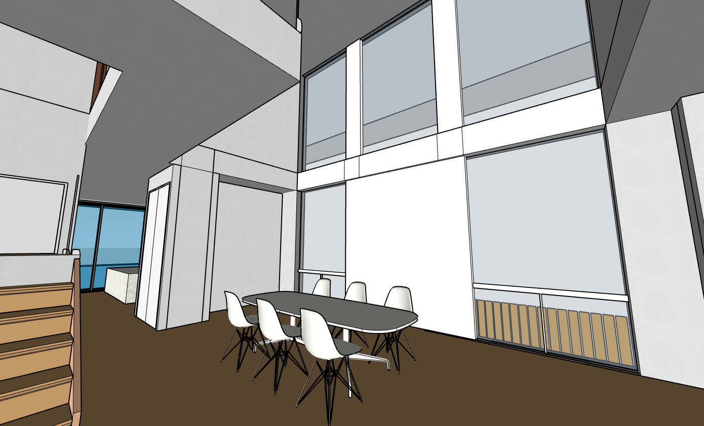 bauhaus interior shot contemporary dining room with double height ceiling and large window wall with sunlight shining through keep the windows completely translucent any walls that are solid remain solid do not add glass or any translucent elements to the white solid walls architecture