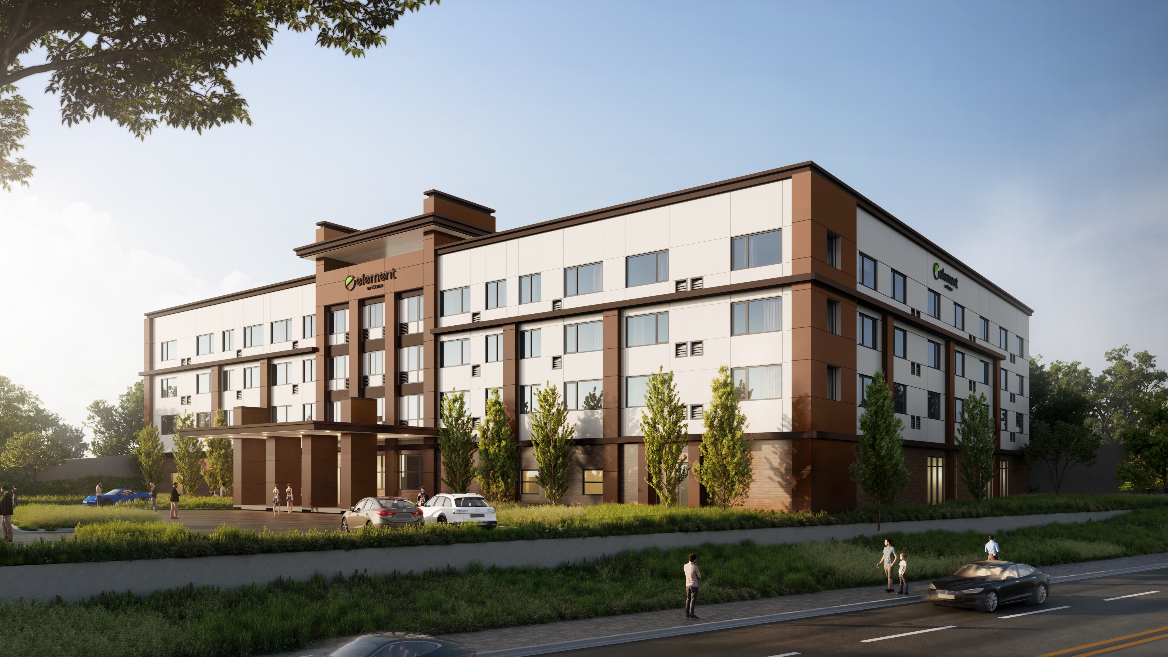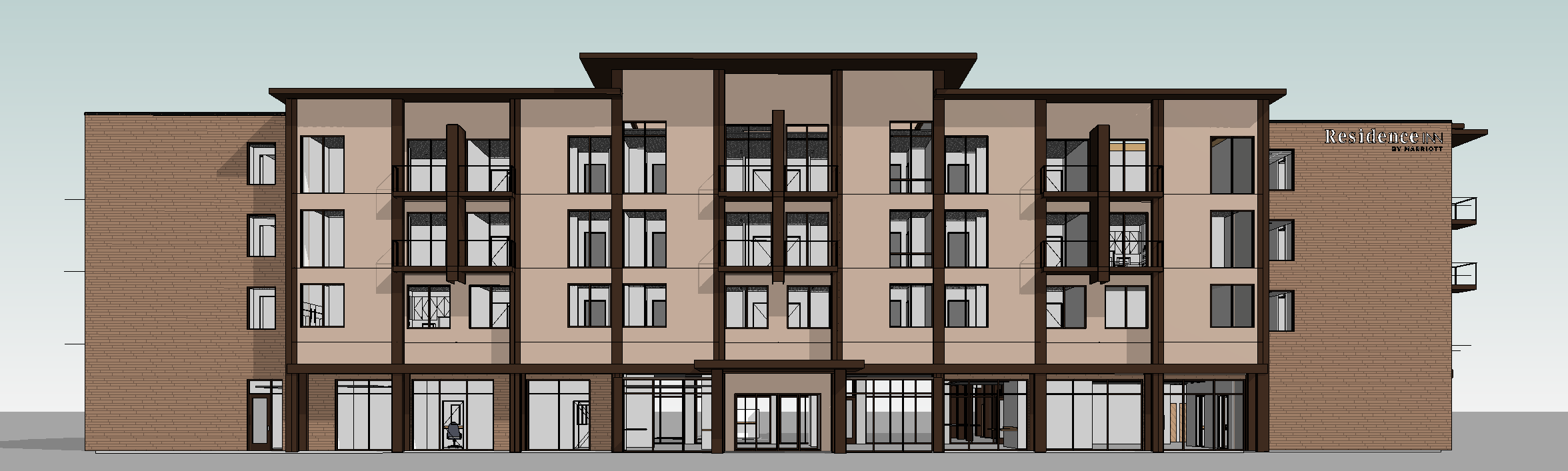 exterior shot mountain modern hotel with stone and wood siding