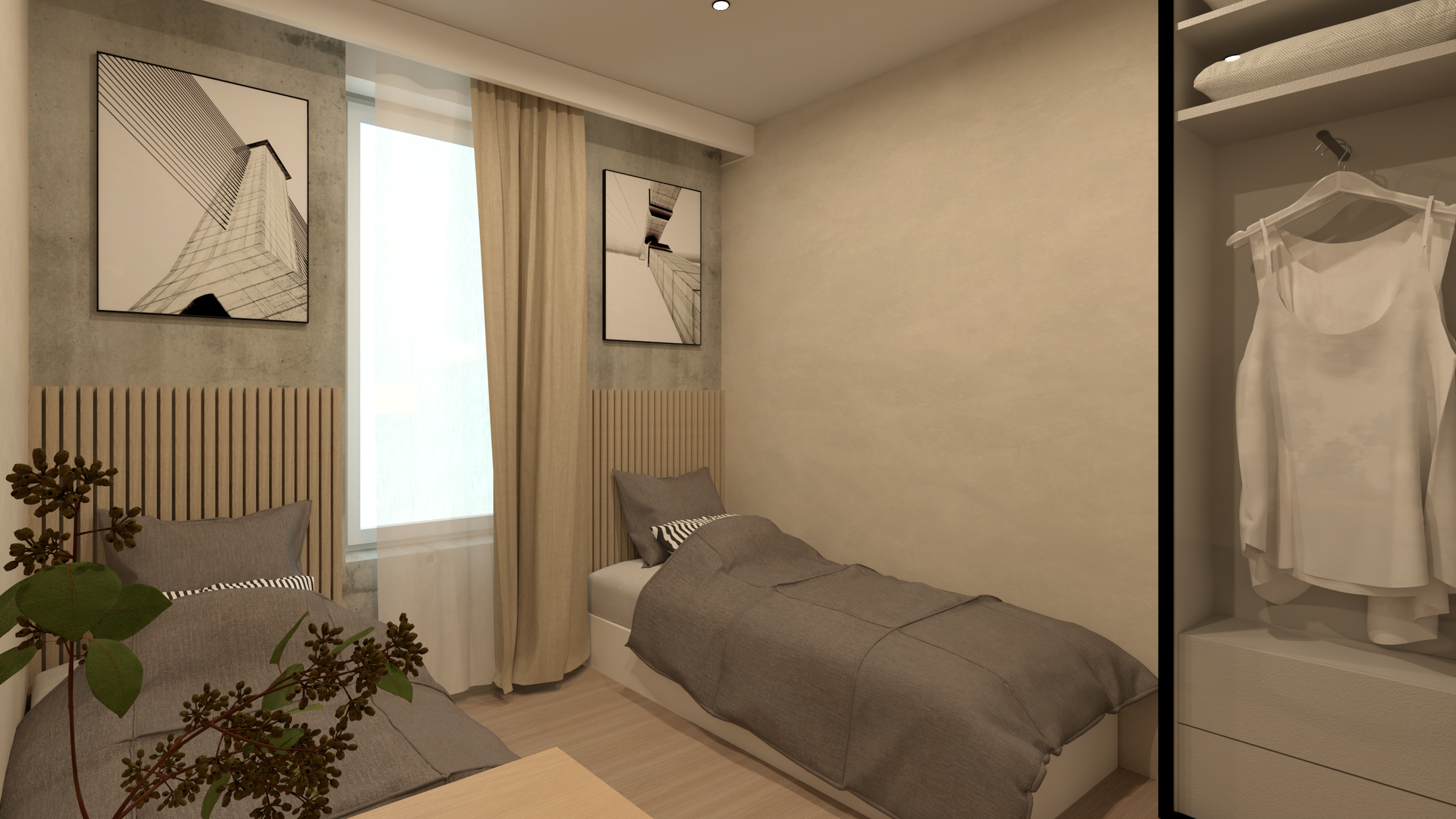interior shot of sleeping room walls in grey tones color daylight scene with lighting on