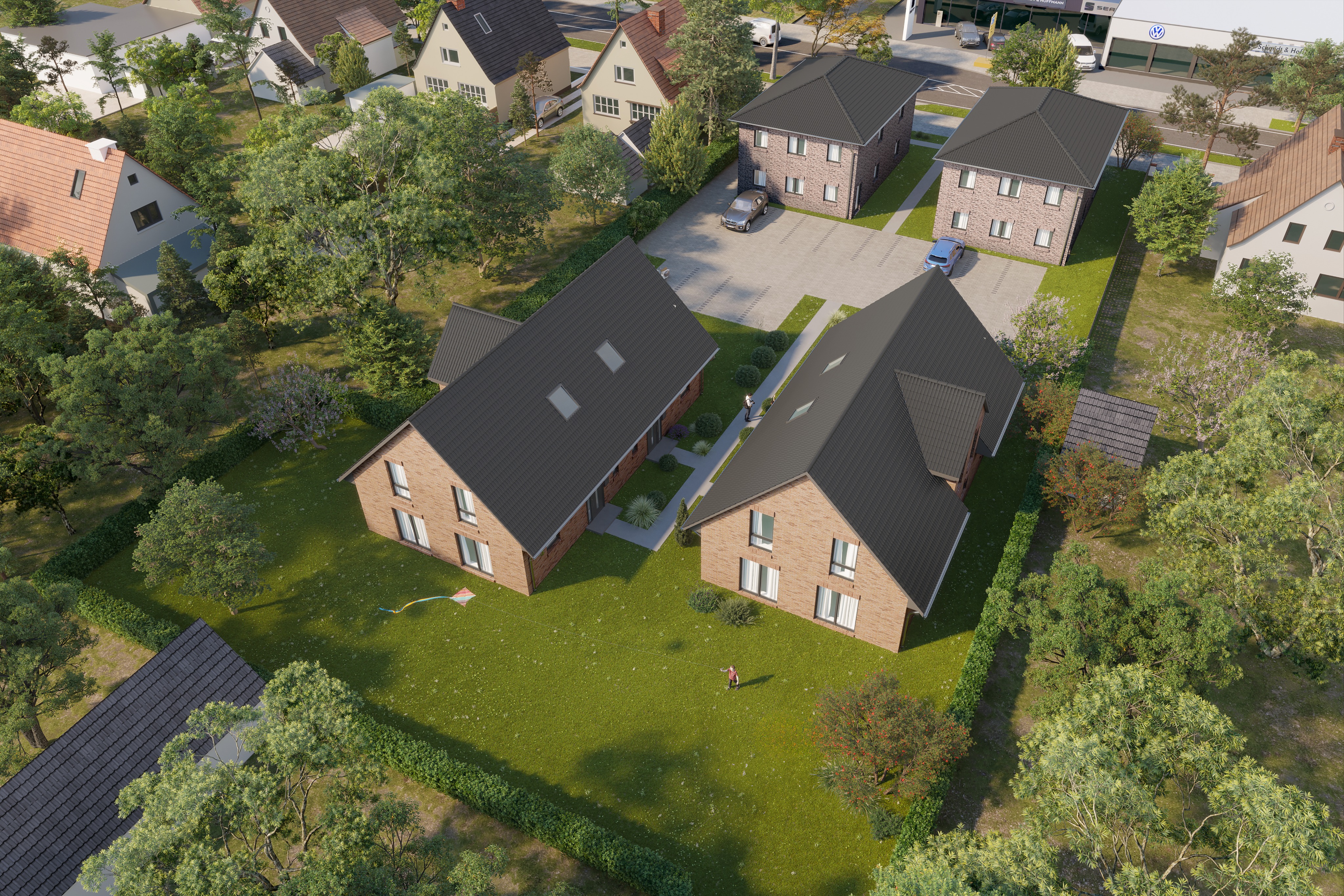 upscale the image quality and add a lush garden design include modern outdoor furniture decorative shrubs and atmospheric lighting