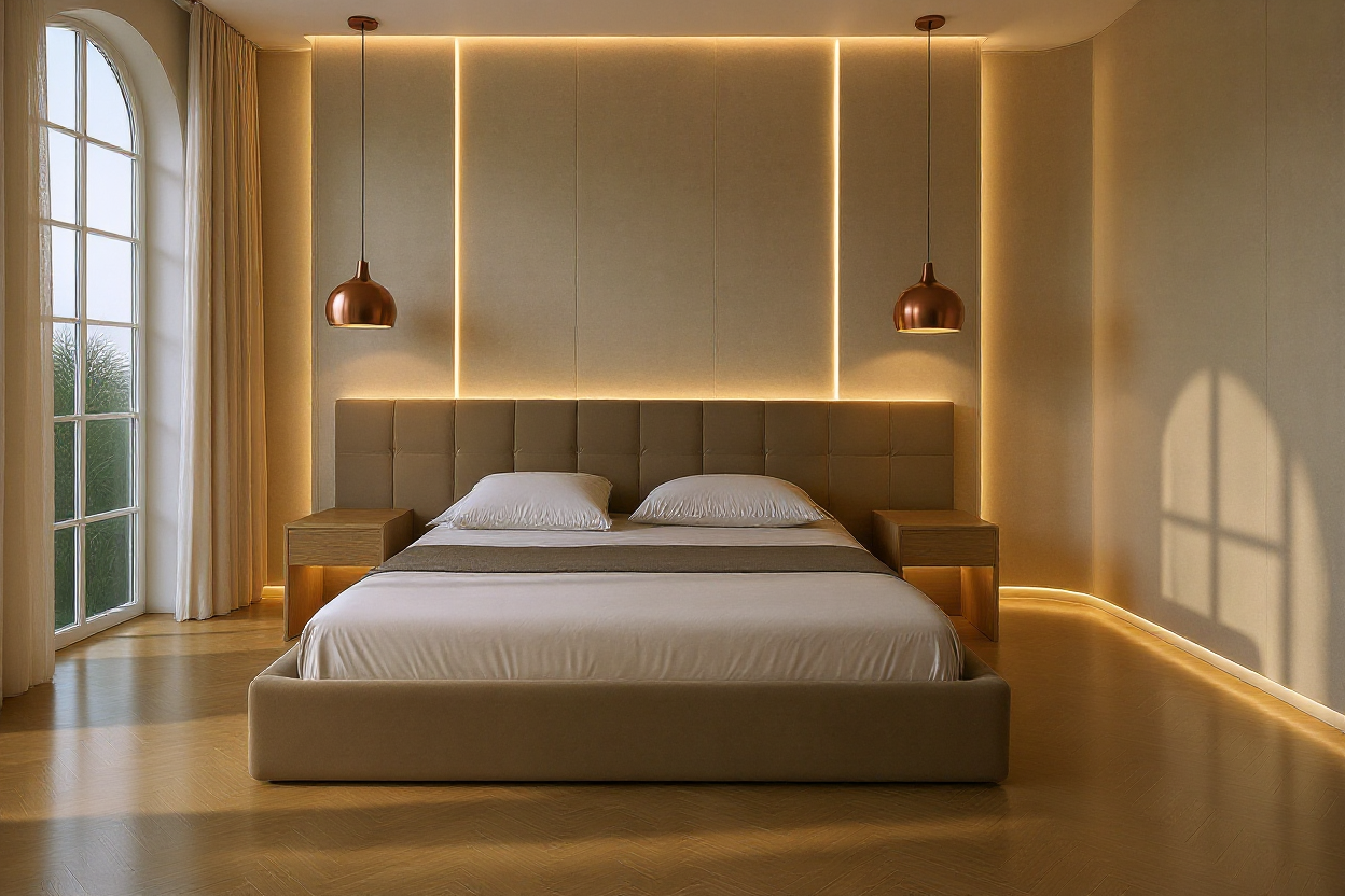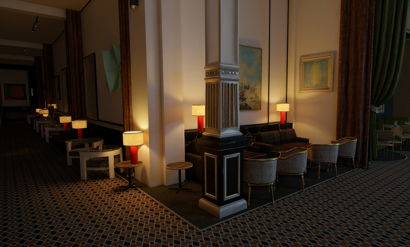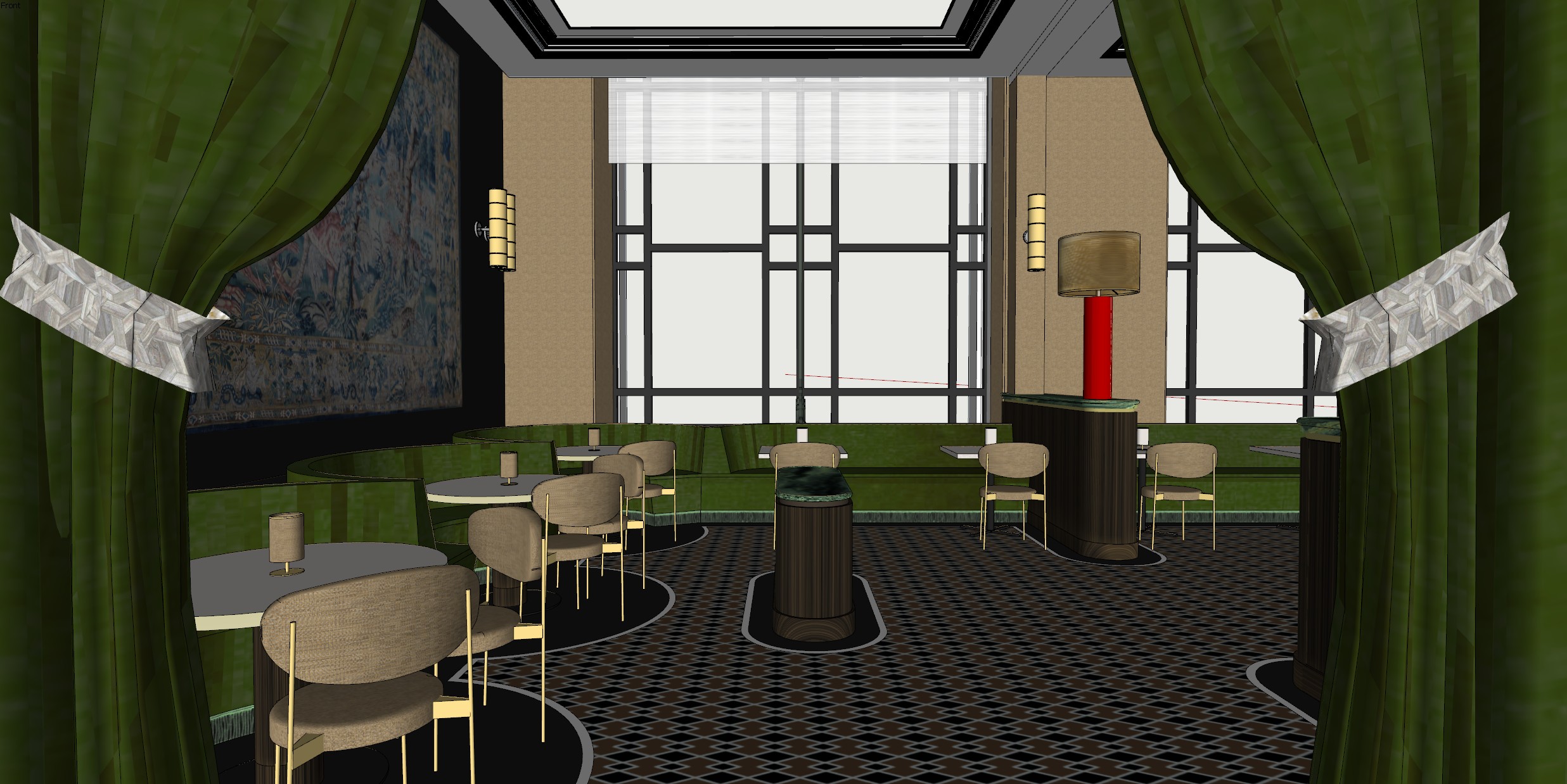 warm natural and work artificial lighting the wall and column are painted white the floor is a bespoke carpet curtain is in velvet fabric the desk chair in fabric the frame is an oil peinting and the table lamps light up and down there are oriented spotloghts fixed to the ceiling large windows with natural light there is an ancient tapistery hanging on the wall the seatings and curtains are in green velvet