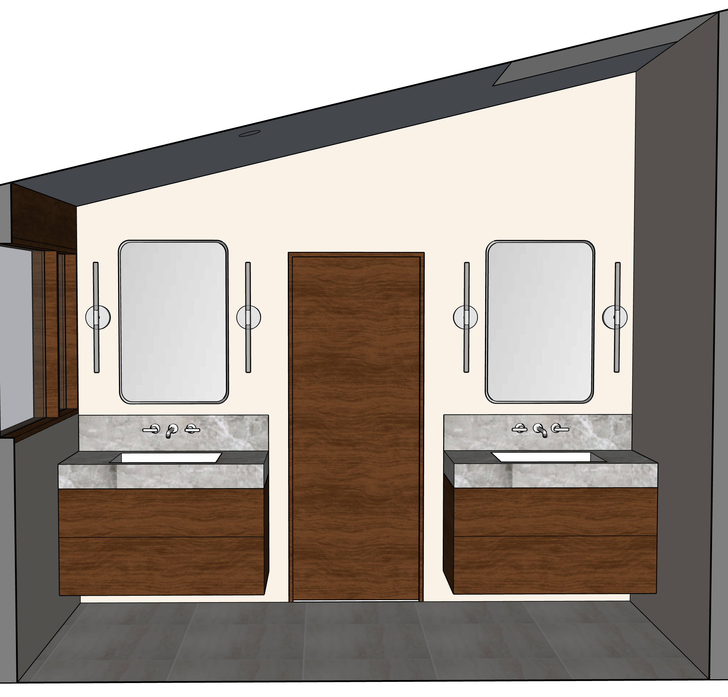 create spa like zen bathroom with soft glow from vanity sconces lighting under floating vanities lighting from left window and skylight above maintain sloped ceiling and architecture shown