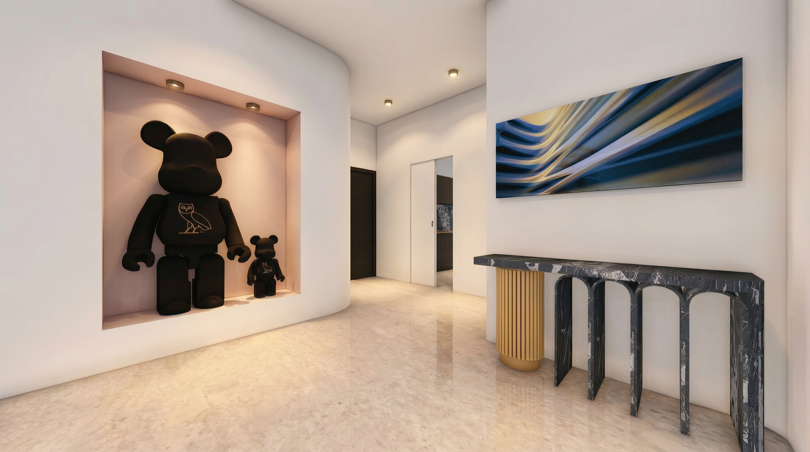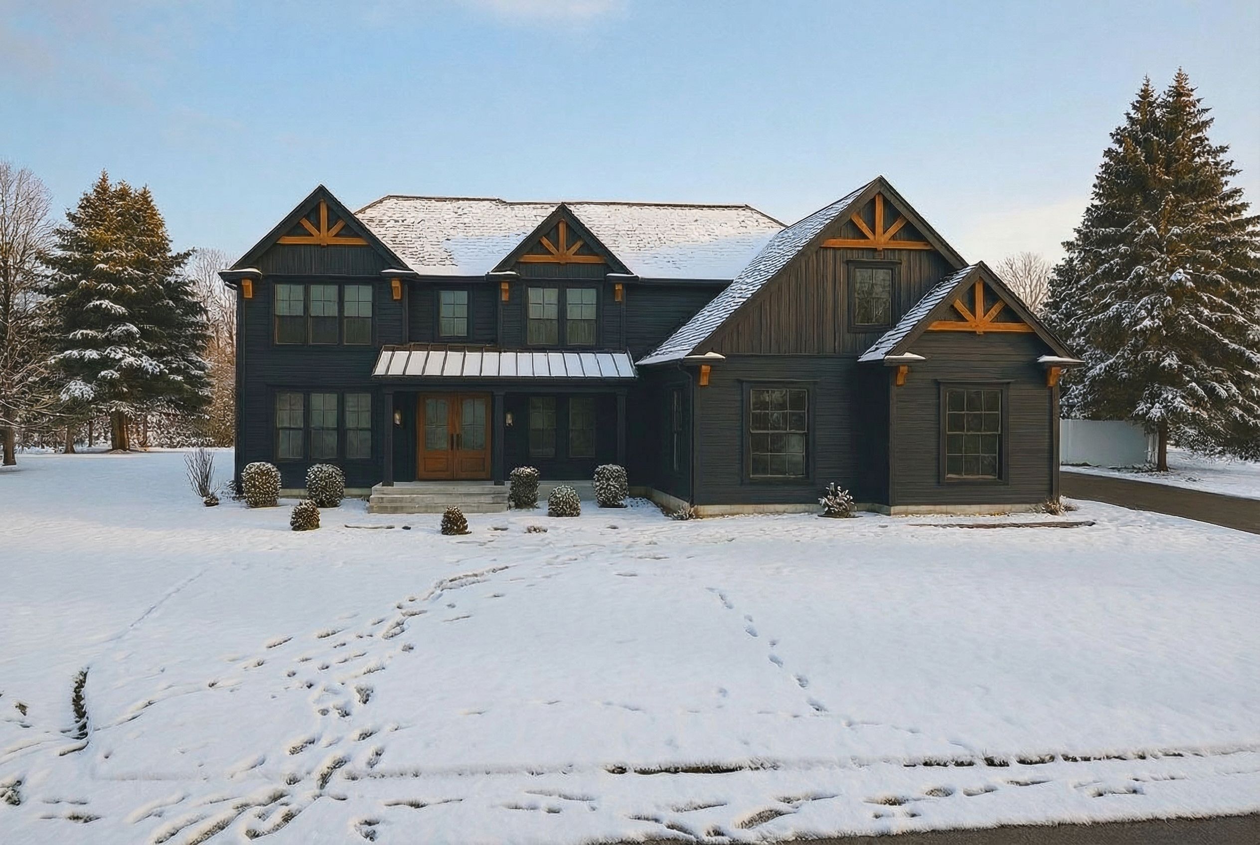 dark grey siding dark brown wood accents on peaks of roof and front door