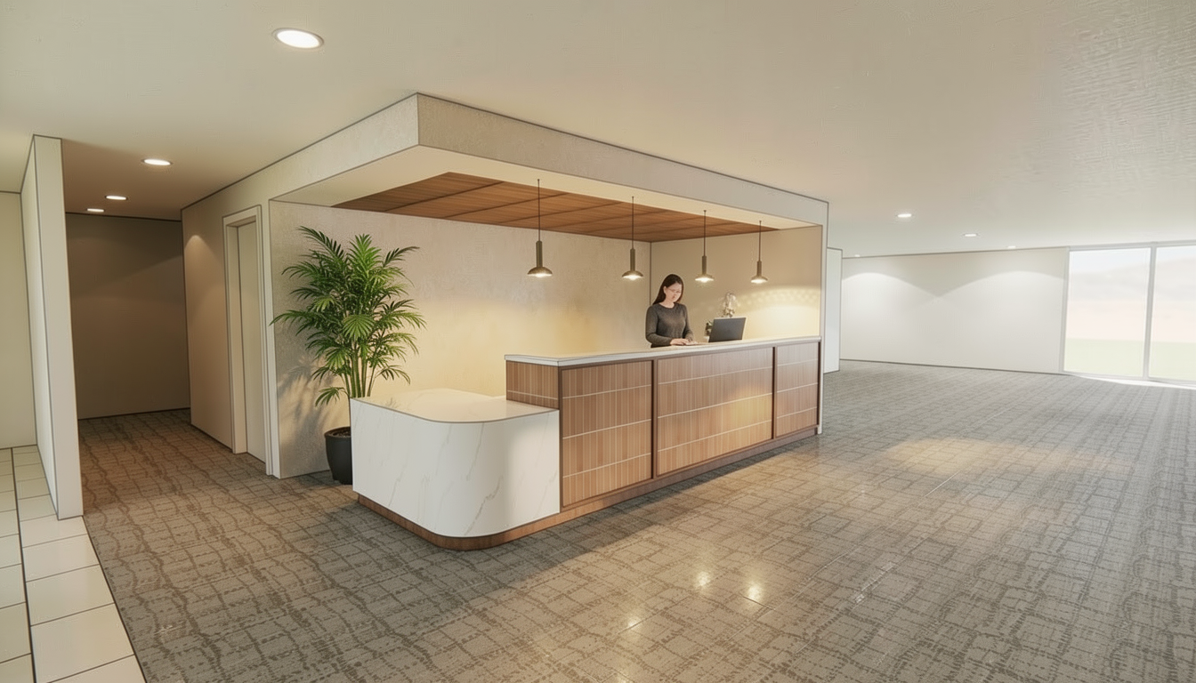 stage this like a reception desk lobby with one plant and a person add some furniture do not change anything about the floor