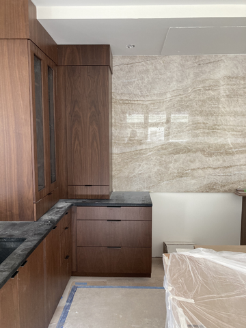 do not change the cabinets in any way preserve the exact cabinet colors materials finishes dimensions door and drawer styles hardware spacing alignment and all geometry exactly as shown do not alter the countertop shape backsplash appliances flooring lighting fixtures or wall structure only remove the construction materials clutter and mess from the scene clean the room and make it look finished and staged add a few simple tasteful home accessories appropriate for the style of the space but do not add or remove any furniture windows or architectural elements maintain the original lighting direction and realism enhance clarity and polish the photo while keeping the cabinetry and room design completely unchanged do not alter the lighting to keep the cabinet colors as they are in the image add new dark green countertops put in a faucet a dishwasher to the left of the sink in the opening stage the glass cabinet put a beautiful great room in the background add new flooring