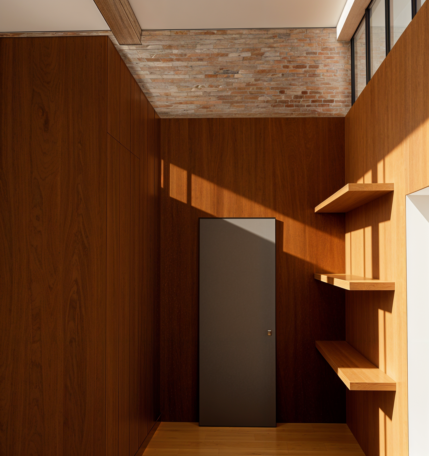 render this image to make it look real the lighting should be warm and the wood paneling of the cabinetry luxe the beams in the ceiling should be raw concrete