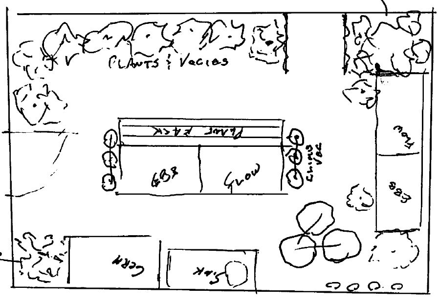 create a rendered floor plan of a greenhouse with hydroponic towers and grow benches stamped concrete floors and potted plants