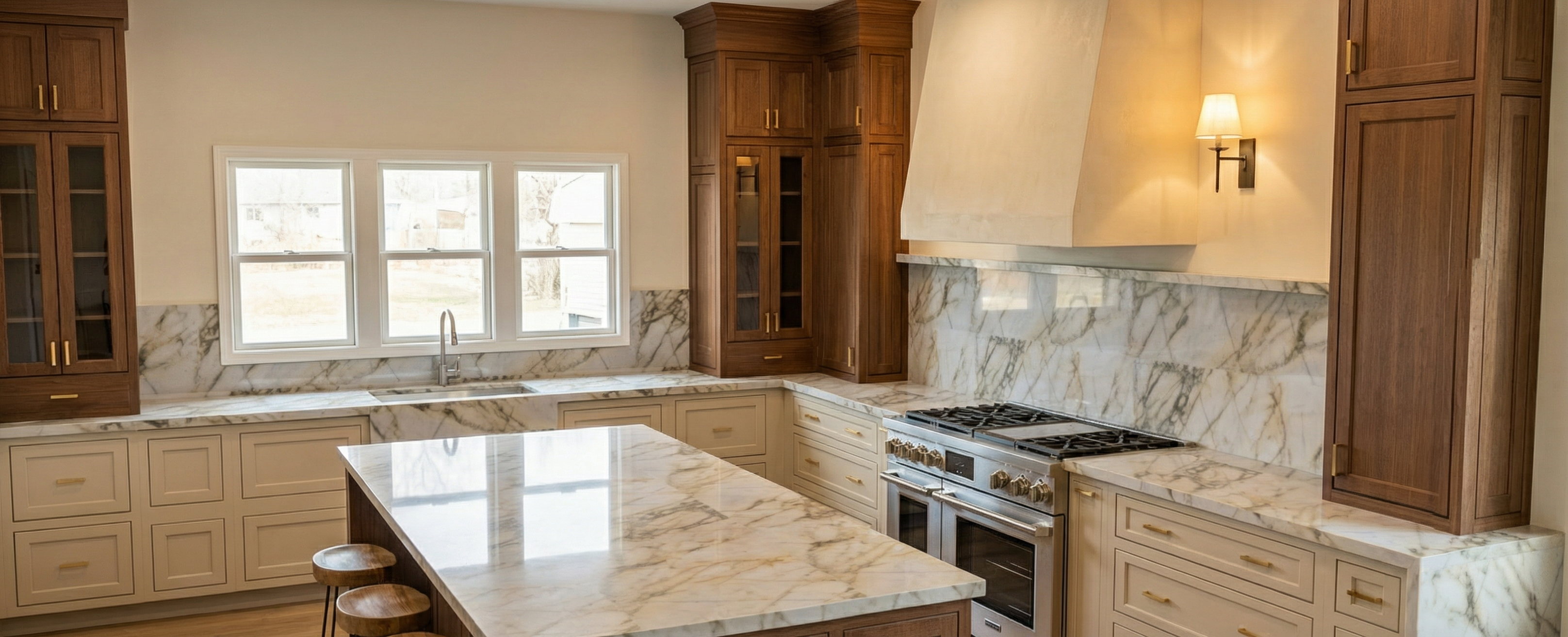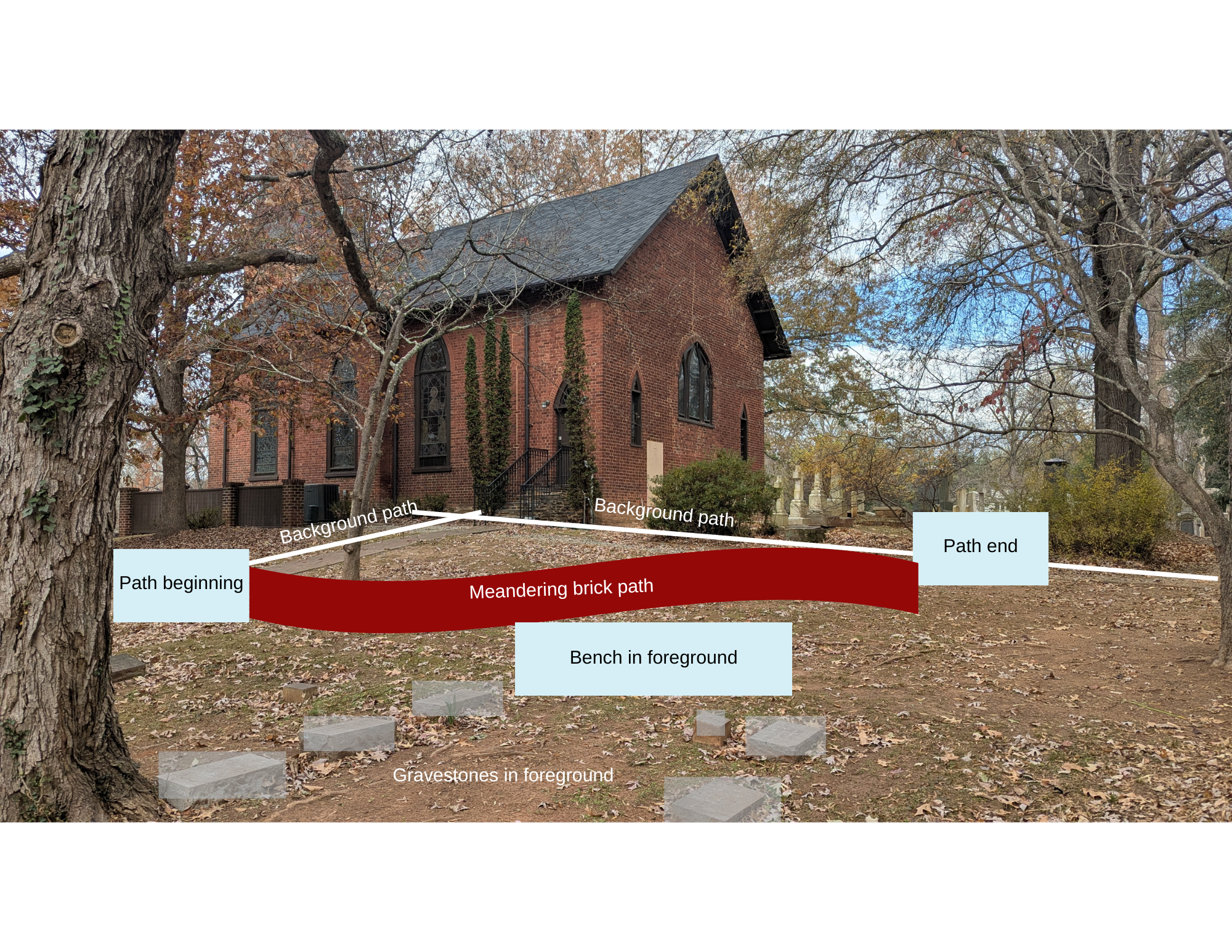 generate a simplified diagrammatic watercolor style illustration based on this annotated photograph focus on spatial layout and circulation not fine detail create a single meandering brick path that runs laterally from left to right across the scene beginning at the left edge and exiting at the right edge following the indicated red path do not place any path or paving in the foreground the foreground must remain open ground or meadow place a wooden bench clearly in the foreground centered horizontally acting as a pause or seating area separate from the path position the memorial markers along the brick path closer to the church building clearly in the background relative to the bench preserve the church massing major trees and general site proportions but simplify textures and details use flat color washes soft edges and minimal linework to establish depth planes foreground midground background do not add ornamental plant detail lighting inscriptions or surface texture at this stage prioritize correct path direction scale relationships and spatial hierarchy over realism