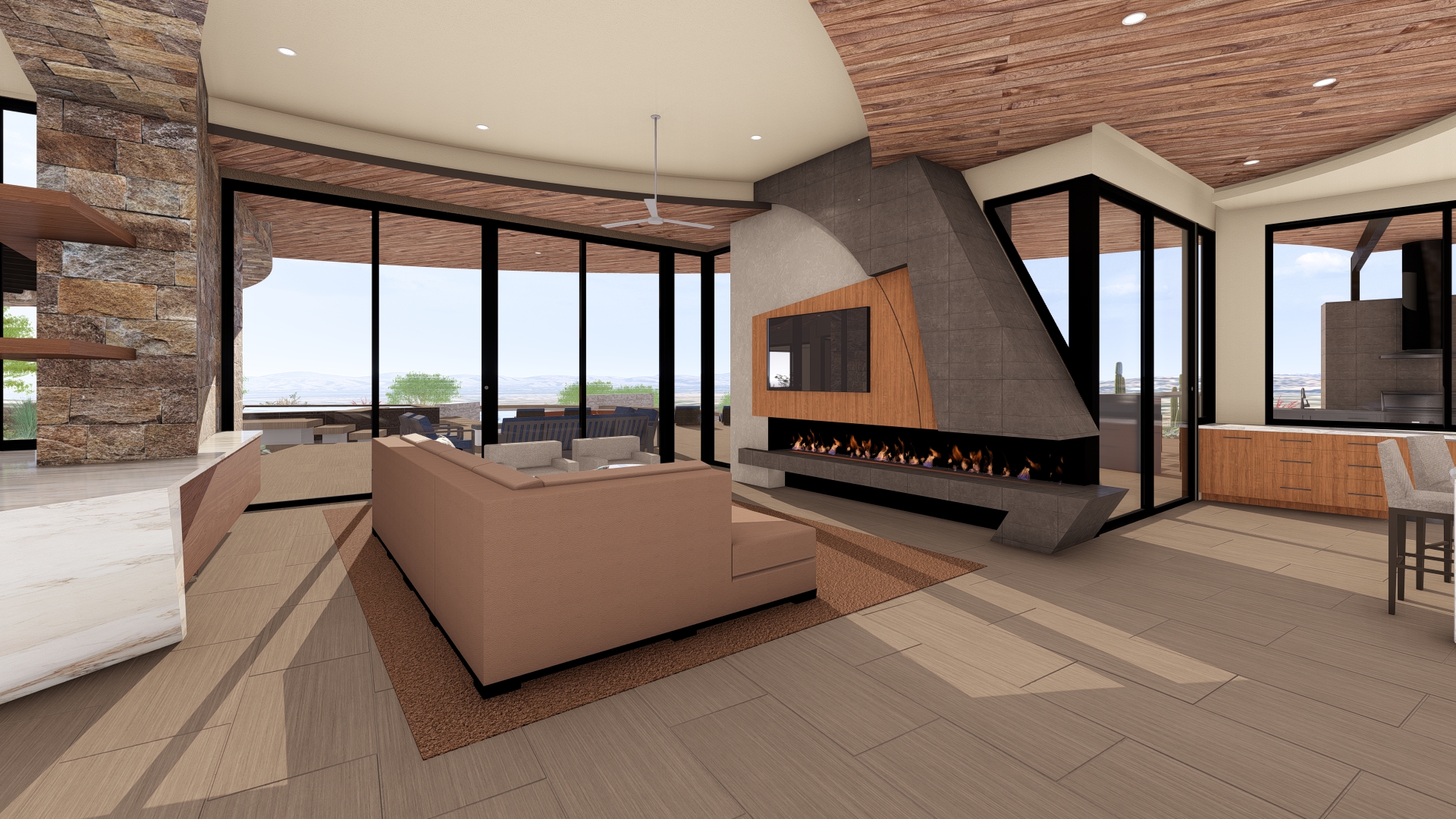 photorealistic enhancement of the provided image this is a post processing realism pass only not a redesign all architectural geometry must remain identical to the original image including but not limited to the fireplace hearth firebox opening stone massing concrete planes angles seams tv location window geometry ceiling geometry and wall geometry do not alter reinterpret simplify subdivide or reshape any architectural elements the fireplace geometry must remain exactly the same as the original image improve realism only through lighting quality global illumination shadow depth material reflectance accuracy subtle surface imperfections camera exposure color grading depth of field and realistic noise or grain furniture and accessories may be replaced with realistic high end contemporary furniture of similar scale but must not affect or intersect architectural elements maintain original camera angle and composition