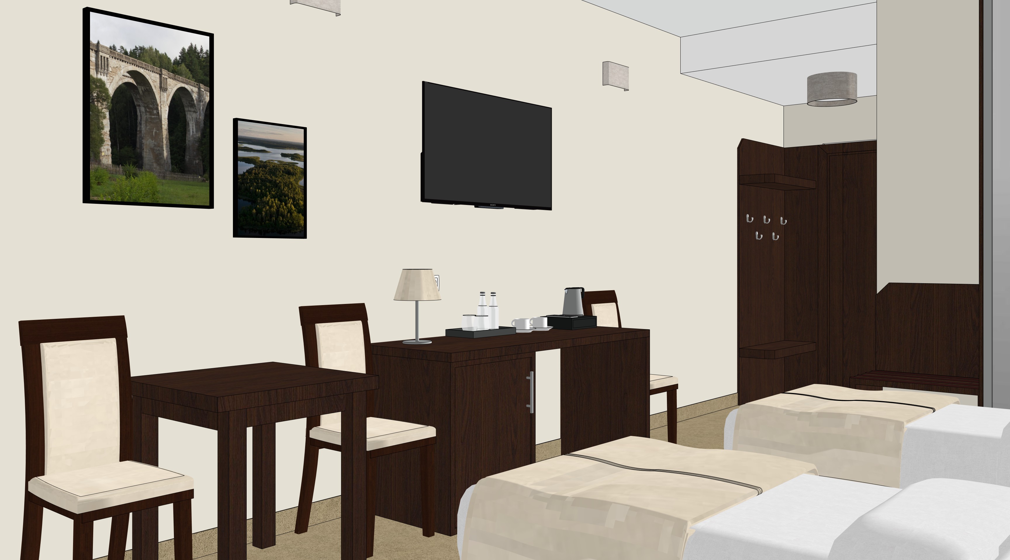 interior shot hotel room table and desk tv on the wall and two photos in frames save my size of picture