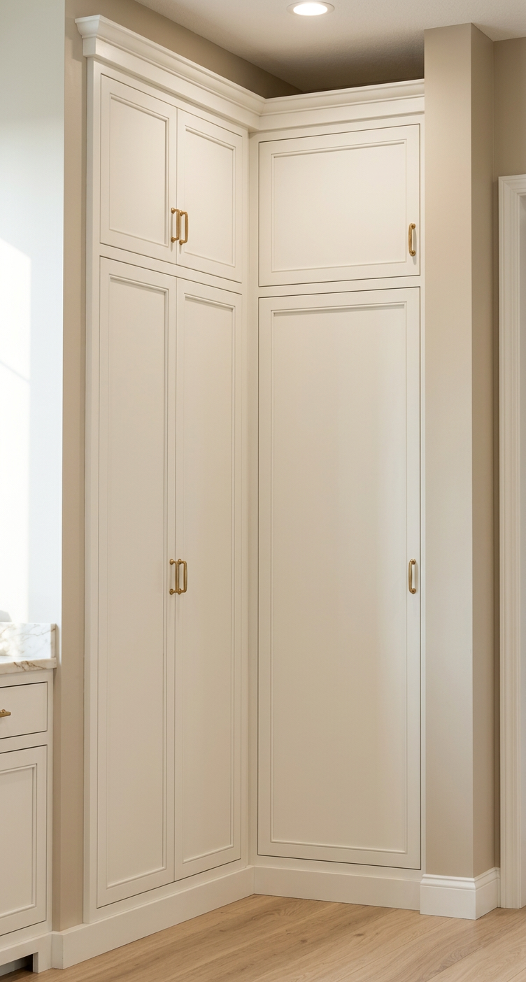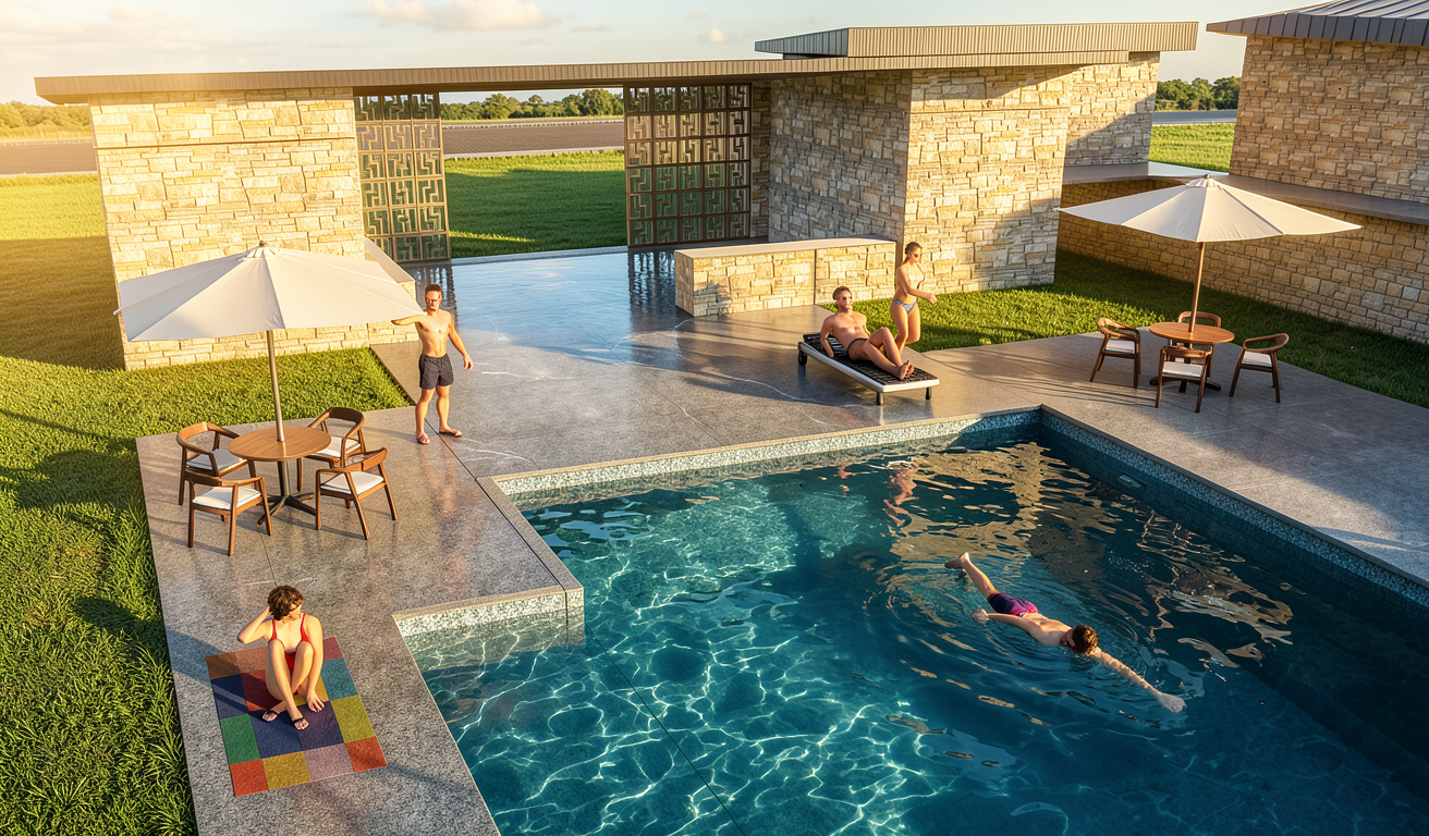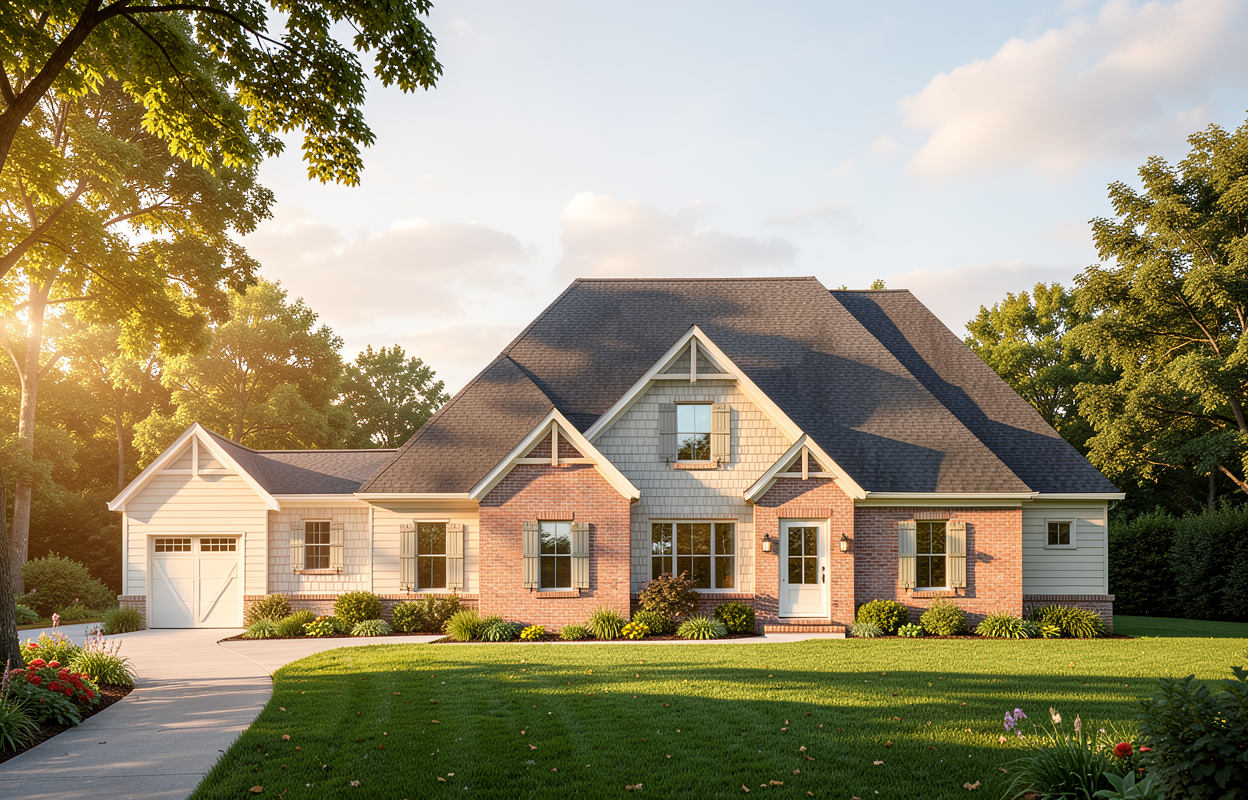 render a modern house with a clean contemporary design the building features white brick walls dark gray metal roofs and a striking rust colored accent on one part of the facade incorporate sleek large windows that reflect the natural surroundings the foreground is lush with neatly trimmed green hedges and rounded bushes a smooth gray stone path leads to the entrance set the house against a backdrop of clear blue sky with scattered white clouds and surrounded by tall vibrant green trees casting soft shadows the atmosphere is tranquil and inviting with natural sunlight highlighting the textures and colors beautifully