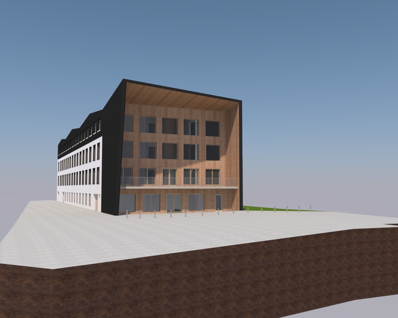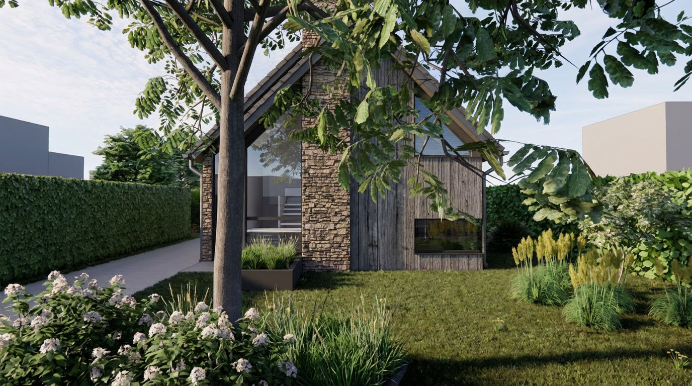 photorealistic architectural render of the provided model strictly preserving original geometry proportions and structure no deformation or redesign natural lighting realistic materials concrete glass wood metal with accurate reflections and textures shot as if taken with kodak portra 400 film soft grain warm tones balanced contrast subtle color fading global illumination soft shadows ambient occlusion high dynamic range real world camera settings 35mm lens shallow depth of field cinematic composition realistic exposure exterior daylight scene slightly overcast sky for soft lighting ultra detailed high resolution physically accurate rendering add slight film imperfections analog grain subtle chromatic aberration light bloom and realistic lens imperfections to enhance kodak 400 aesthetic