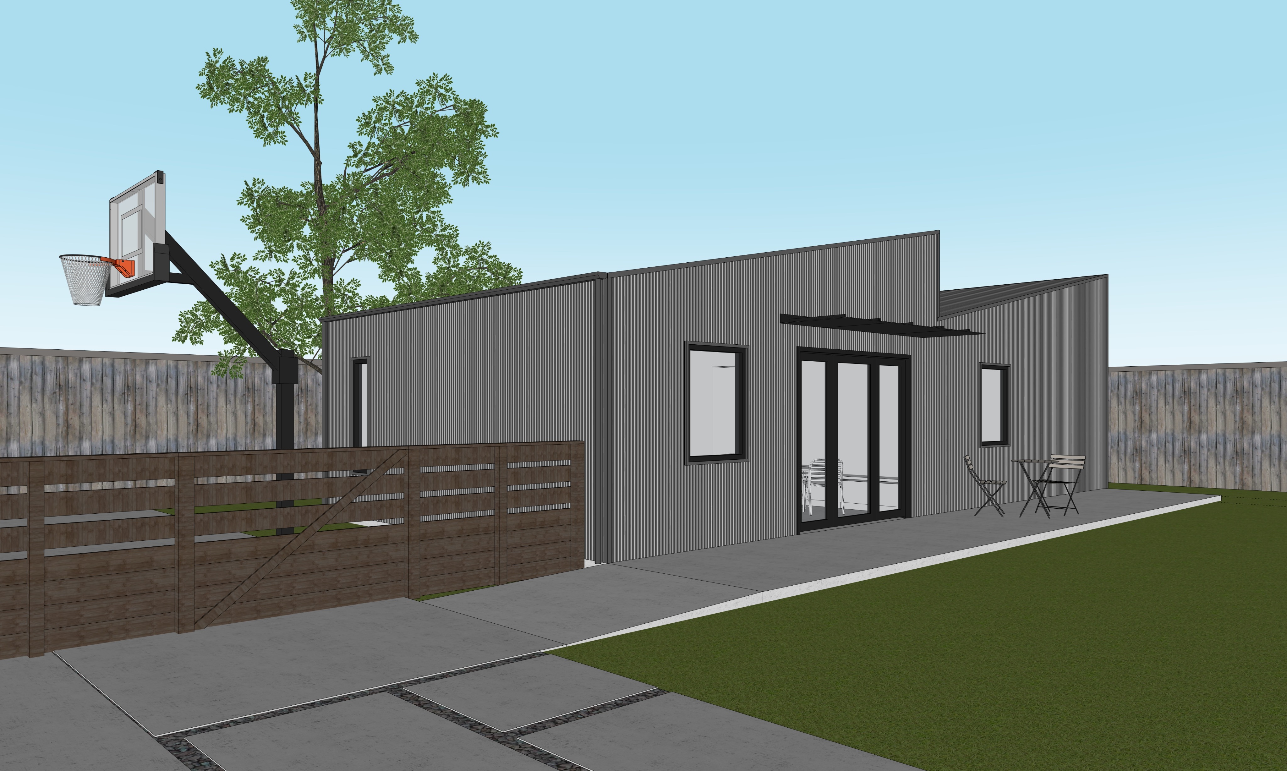 render a modern minimalist house with a sleek corrugated metal exterior in a shade of slate gray the house features large glass windows and doors framed in matte black offering a contemporary look surround the house with a lush green lawn set against a backdrop of a weathered wooden fence in muted earth tones a basketball hoop is positioned in the foreground with a metallic pole and a net with white details a green tree stands tall beside the house adding a touch of nature the sky is a clear serene blue evoking a calm and peaceful atmosphere include a small patio area with a simple outdoor table and chairs in black complementing the modern aesthetic