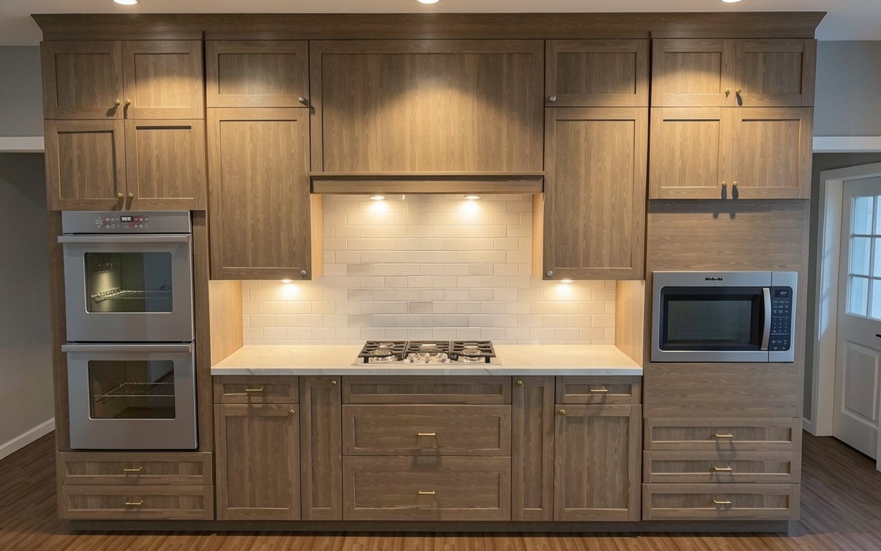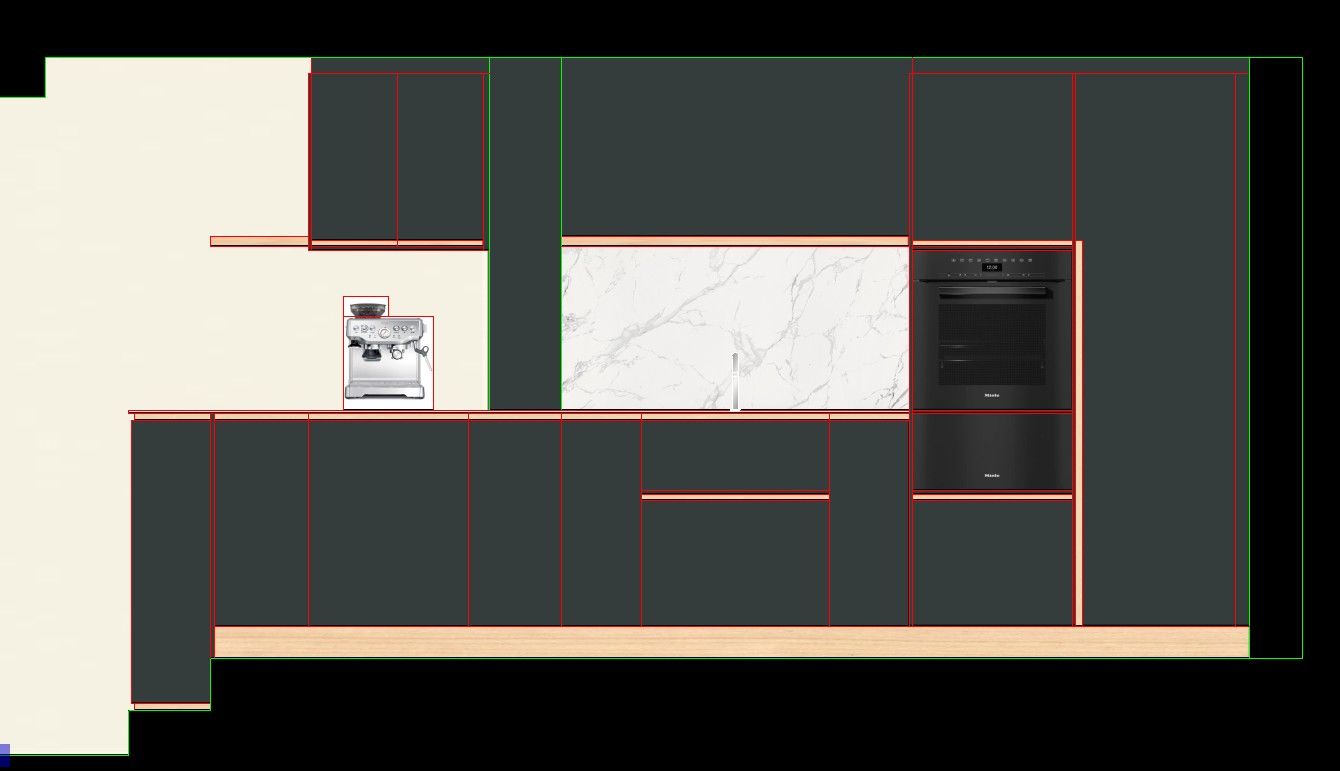 generate a photo realistic render using this elevation keep all materials and finishes the same the green is studio green by farrow and ball wooden elements are lime washed oak add lighting to the bottom of the shelf and wall cupboards
