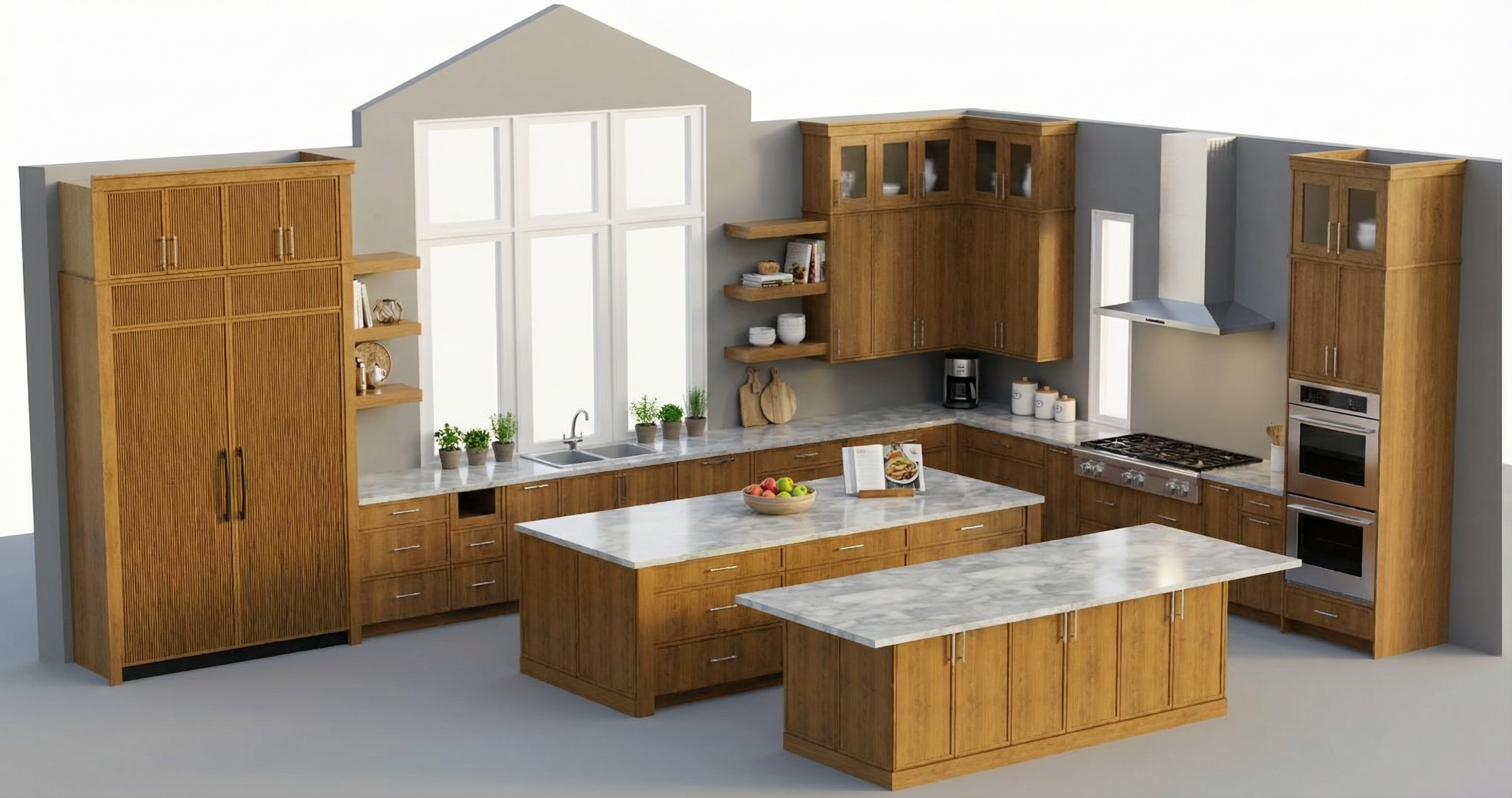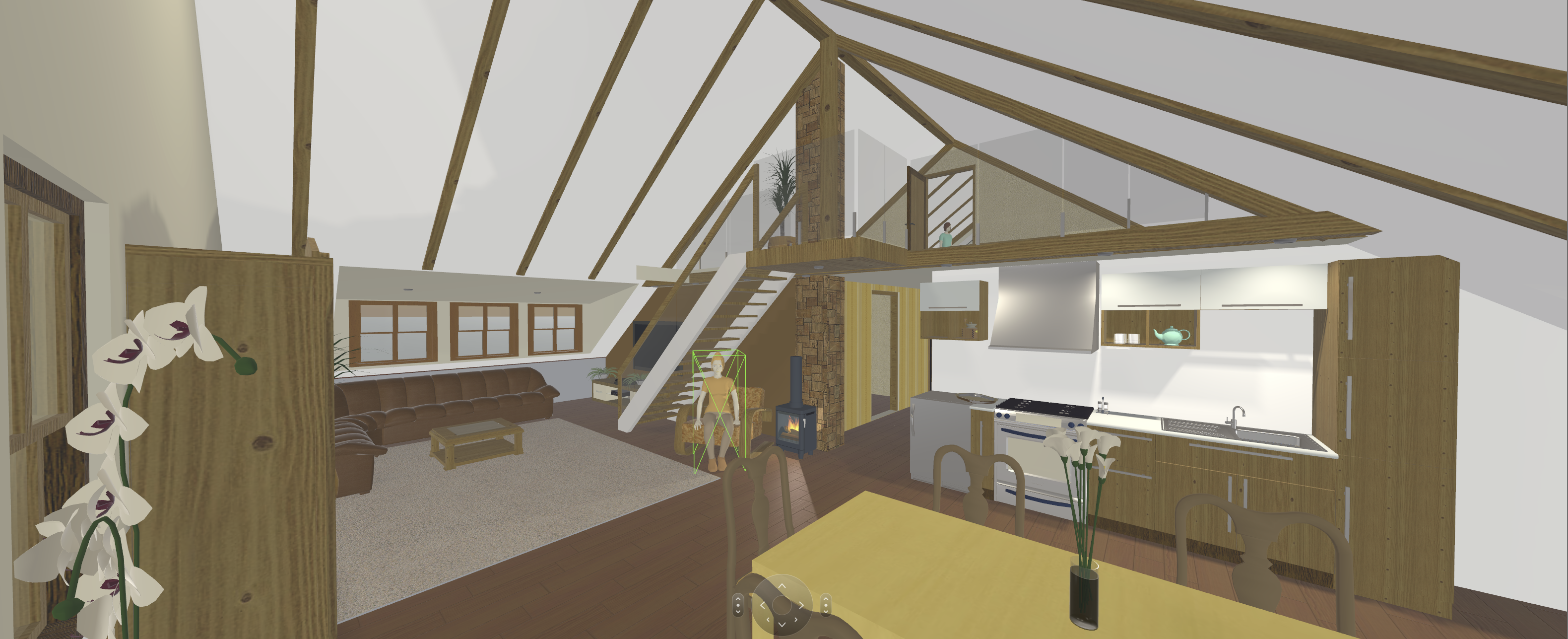 a cozy open concept living and kitchen area with high pitched wooden ceilings and beams the atmosphere is warm and inviting the walls are painted in a soft cream color the kitchen features sleek white cabinets with light wooden accents and a modern stainless steel stove a vase of elegant white orchids with hints of purple sits on a wooden dining table a comfortable brown leather sofa is placed on a beige carpet in the living area the space is brightened by natural light streaming in through large windows with wooden frames a wooden staircase with a glass railing leads to an upper loft the floor is a rich dark hardwood adding warmth to the space a wood burning stove with an orange glow provides a cozy ambiance