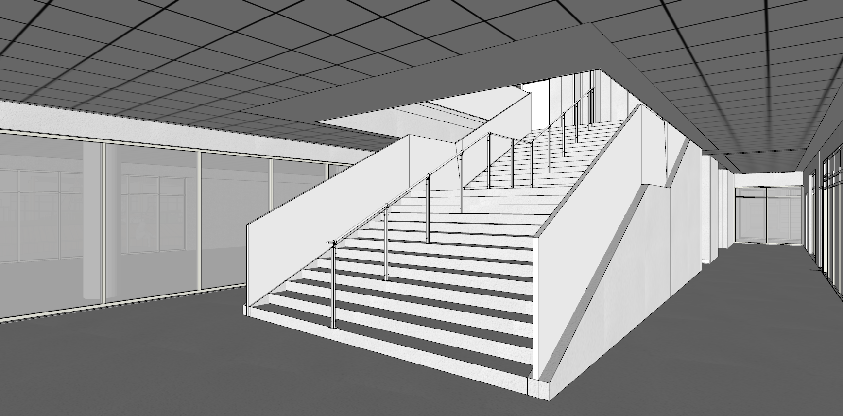 postmodern interior shot floor tiles stone stairs semple design accoustic ceiling 60 60 plaster grey window architecture