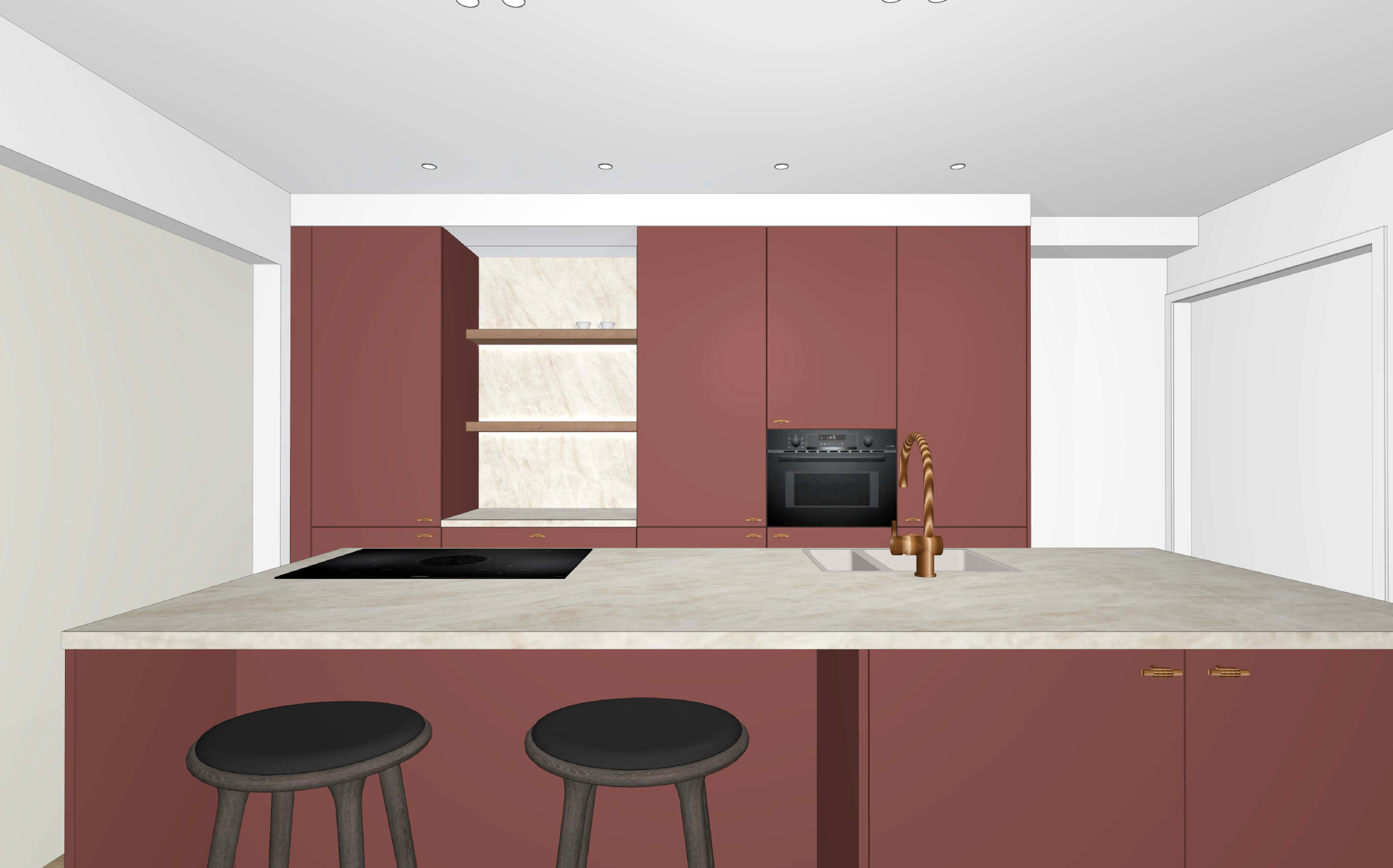 maak een ultra hoogwaardige fotorealistische architecturale interieur render op basis van de ge ploade referentieafbeelding de volledige ruimtelijke indeling afmetingen verhoudingen architecturale opbouw materiaalplaatsing kleuren meubels camerapositie kijkhoek perspectief en compositie moeten 100 identiek blijven aan de referentieafbeelding er mag geen herontwerp herinterpretatie of verplaatsing van elementen plaatsvinden het ontwerp de meubels en de kleurencompositie zijn absoluut leidend architecturale elementen materialen exact behouden keukenopstelling volledige hoge kastenwand in evening red unilin mat strak vlakke fronten centraal kookeiland in identieke afwerking ingesneden open nis in de kastenwand doorkijk naar raam rechts exact behouden alle verhoudingen kastenindeling en nispositie exact zoals referentie wanden plafond alle wanden en plafonds in ral 9010 mat geschilderd strakke moderne afwerking steen bovenblad eiland marazzi taj mahal achterwand marazzi taj mahal achterwand open nis marazzi taj mahal doorlopend natuursteenbeeld licht warm beige subtiele aders satijn matte afwerking hout legboorden valley ash sunlit brown stoelen valley ash sunlit brown warme lichtbruine tint fijne nerf mat metaal kraan donker koper geborsteld handgrepen donker koper geborsteld warm verfijnd niet glanzend toestellen kookplaat puxu zwart strak ge ntegreerd inbouwoven bosch accentline zwart glas minimalistisch verlichting kritisch enkel natuurlijk daglicht geen zonlicht diffuse lichtinval via raam rechts zachte globale verlichting inbouwspots in plafond die effectief licht geven led onder legboorden 1 verticale led bovenaan in de open nis warm wit licht architecturaal ge ntegreerd subtiele schaduwen onder eiland in nis en langs kasten uitzicht uitzicht door raam rechts op een tuin groen rustig natuurlijk iets zachter belicht dan het interieur fotografische dieptewerking camera fotografie instellingen professionele architecturale interieurfotografie full frame camera look brandpuntsafstand 24 35 mm rechte verticalen geen vertekening exact hetzelfde standpunt als referentie subtiele realistische scherptediepte sfeer uitstraling warme hedendaagse luxe hoogwaardig maatwerkinterieur rustige architecturale compositie italiaanse designkeuken uitstraling realistisch bewoonde maar opgeruimde setting tijdloos verfijnd elegant render en materiaalkwaliteit ultra fotorealistische high end architecturale visualisatie haarscherpe 4k kwaliteit physically based rendering pbr materialen correcte ruwheid reflecties en microstructuren realistische natuursteenaders correct houtreli f in legboorden en stoelen natuurlijke kleurbalans en correcte witbalans geen cgi plastic of illustratie uitstraling negatieve prompt altijd toevoegen vermijd cgi look renderachtige uitstraling illustratie cartoonstijl zonlicht harde lichtvlekken overscherping verkeerde kleuren verkeerde roodtint verkeerde houtsoort foutieve nerf glanzende kasten plastische materialen foutieve schaal vervormd perspectief extra meubels toegevoegde decoratie mensen rommel ruis blur soft focus overbelichting onderbelichting onrealistische reflecties zichtbare lichtbronnen fout marmerpatroon