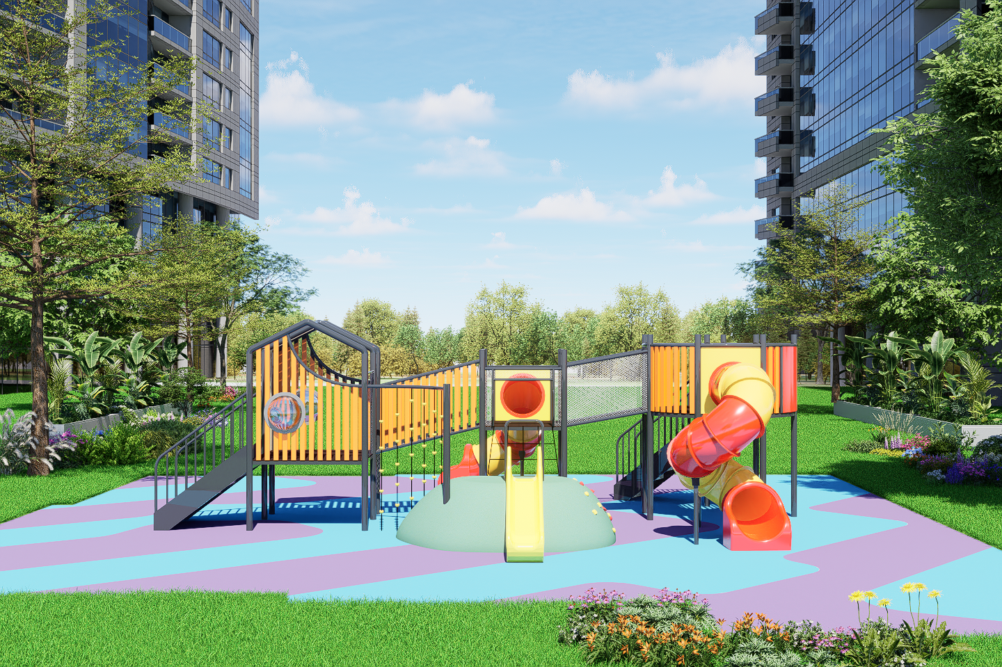 please do not change the original playground layout or angles and do not modify the playground epdm the setting should remain clearly outdoors surrounded by lush well maintained landscaping including mature trees layered shrubs and green buffer zones for privacy and comfort shrubs and hedges should form a boundary separating the playground from adjacent areas the ground treatment around the playground should consist of well kept grass and appropriate outdoor safety surfacing blending naturally into the surrounding lawn and landscape the left and right sides should show residential condominiums add realism