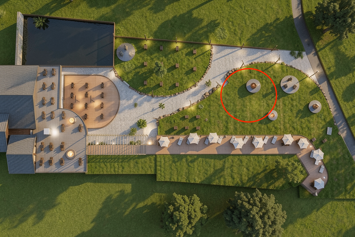 use the red circle only as a placement and size reference and remove it in the final image important do not modify remove simplify or regenerate any existing buildings paths terraces landscaping furniture water areas lighting or scene elements keep everything exactly as in the original image insert one circular umbrella bar inside the red circle size and position the red circle represents the exact outer diameter of the pavilion base keep the structure exactly centered in the circle diameter approximately 10 11 meters design polygonal circular structure many sides approx 24 28 sides dark oak wooden frame full height glass walls on all sides no solid walls anywhere roof dark grey fabric tensile canopy the fabric roof must fully cover the entire structure extending to the outer perimeter no rigid roof no metal roof no gaps between fabric and structure temporary removable pavilion appearance interior one circular bar counter only all equipment inside the counter no external furniture fridges or storage outside the bar scene constraints remove the red circle and any graphic marks do not change lighting materials colors or camera view keep all surrounding elements unchanged photorealistic aerial render