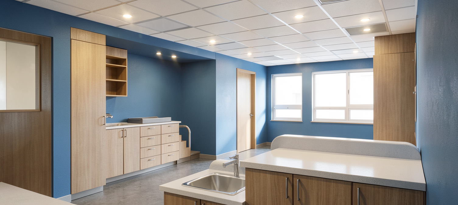 photorealistic architectural interior render of a childcare center cpe based strictly on the provided sketchup image do not add remove or modify any architectural elements furniture openings or layout keep all objects proportions and positions exactly as modeled all existing ceiling light fixtures must be turned on and emit soft realistic illumination combine artificial lighting with natural light if present keeping a balanced and believable exposure preserve the original colors and materials but enhance them with realistic textures accurate material properties and subtle imperfections wood grain fabric softness matte finishes child friendly clean calm and warm atmosphere suitable for a cpe environment realistic global illumination soft shadows correct scale neutral camera perspective no dramatic effects no stylization no artistic interpretation ultra realistic architectural visualization professional quality natural color grading no new furniture no extra decor no change in layout no change in wall positions no change in ceiling design no exaggerated lighting no cinematic effects no stylized render no cartoon look no blurred elements add a small number of realistic young children 18 months and older playing calmly on the floor children must be scale accurate naturally integrated into the scene and appropriate for a childcare center neutral clothing colors simple outfits no logos natural poses sitting crawling playing quietly no exaggerated expressions do not modify any architectural elements furniture materials lighting or colors lighting and shadows on the children must match the existing scene perfectly no adults no babies under 18 months no crowded scene no unrealistic poses no exaggerated facial expressions no focus on characters no change to the environment