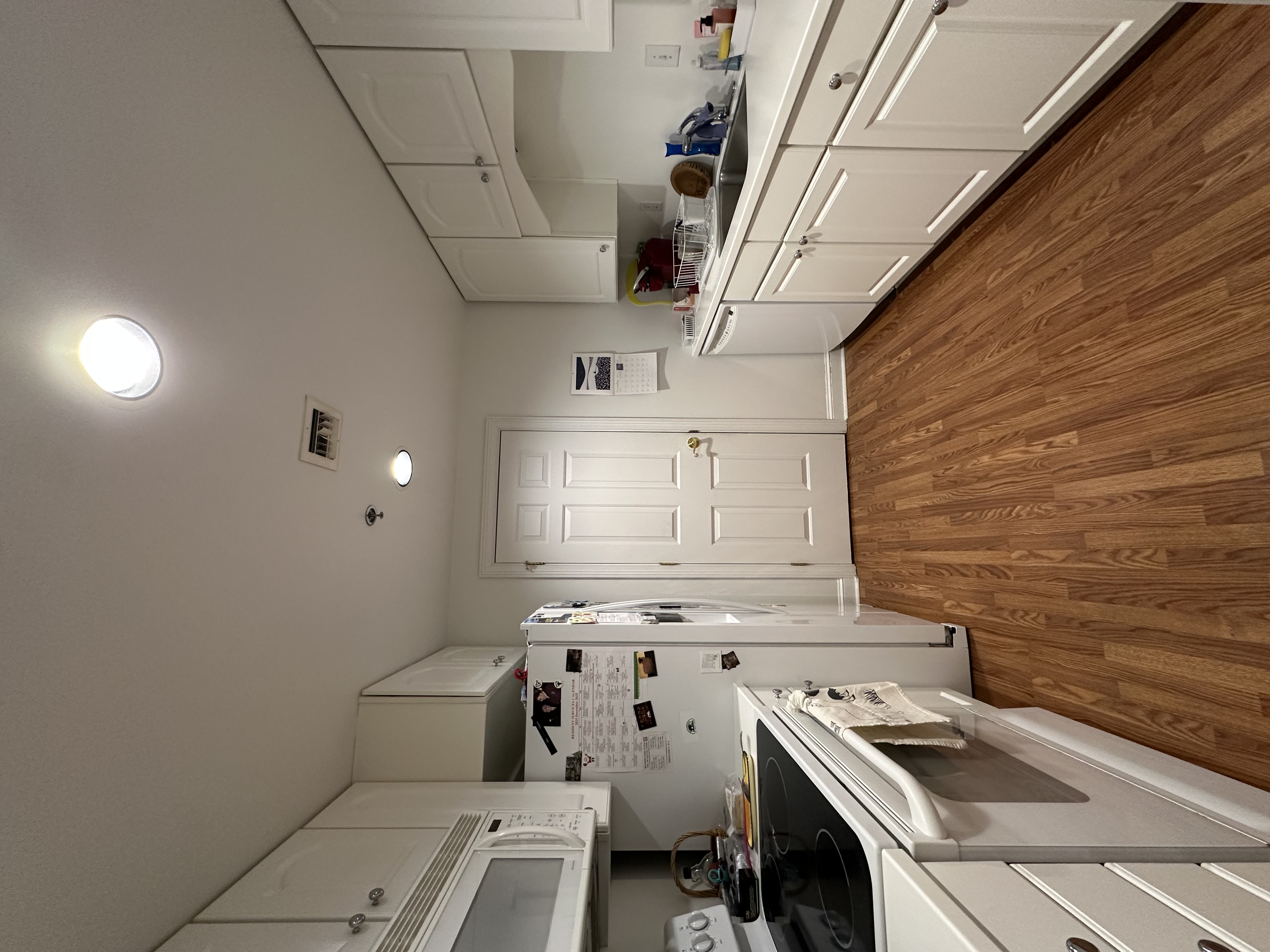 remove the right wall of cabinetry in the kitchen and replace it with an island with a sink in it make all of the kitchen cabinetry white oak with taj mahal quartzite countertops make the appliances stainless steel make the floors white oak hardwood