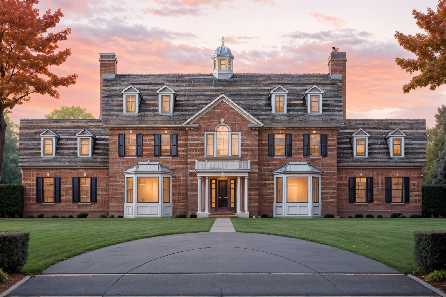 exterior shot exterior photo of a georgian revival style home with white windows red bricks black shutters dark slate for the main house copper roof for the front porch and bay windows and landscaping in front of the house