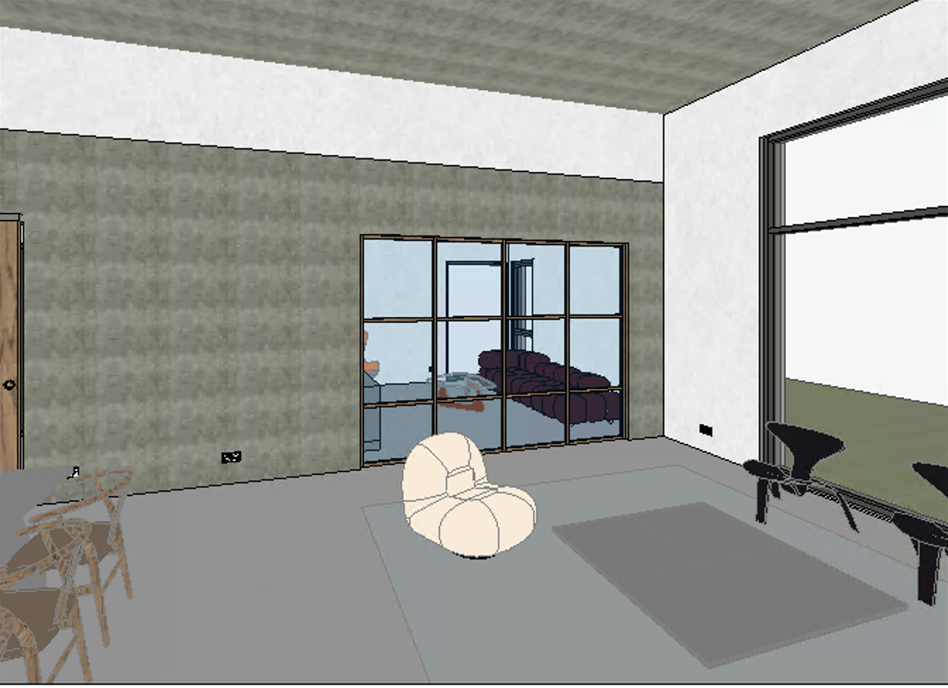 walls in ncs s 2005 y50r color floor in oak herringbone ceiling wood slats curtain wall to be wood with clear glass and added arched posts inside top piece glass add rug and transparent curtains in beige from floor to ceiling