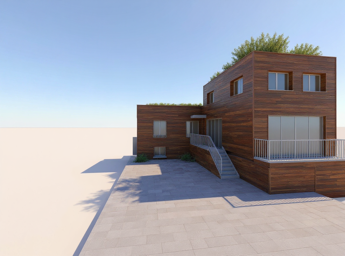 building view use the same perspective and composition as the reference image four story mixed use building with modern brick wood and white accents sharp clean architectural lines with photorealistic materials bright daytime setting with clear sky ground floor fancy restaurant convert the entire first floor into a high end restaurant large glass storefront windows showing warm interior lighting stylish black metal or wood trim details add tasteful signage above entrance outdoor seating area beautifully landscaped with lush greenery planters shrubs grasses modern planters incorporated into the sidewalk tables set for dining stylish tables chairs wine glasses plates food items optional umbrellas or pergolas for shade people sitting at the tables casually dining people activity diverse people enjoying lunch outdoors natural candid body language a few pedestrians walking on the sidewalk well dressed servers or host near the entrance cars street ambiance a couple of parked or passing cars premium sedans or suvs clean well maintained street soft shadows subtle reflections and warm sunlight mood ambiance bright lively daytime atmosphere warm inviting upscale vibe balanced mix of greenery architecture and street life photorealistic lighting texture detail and materials