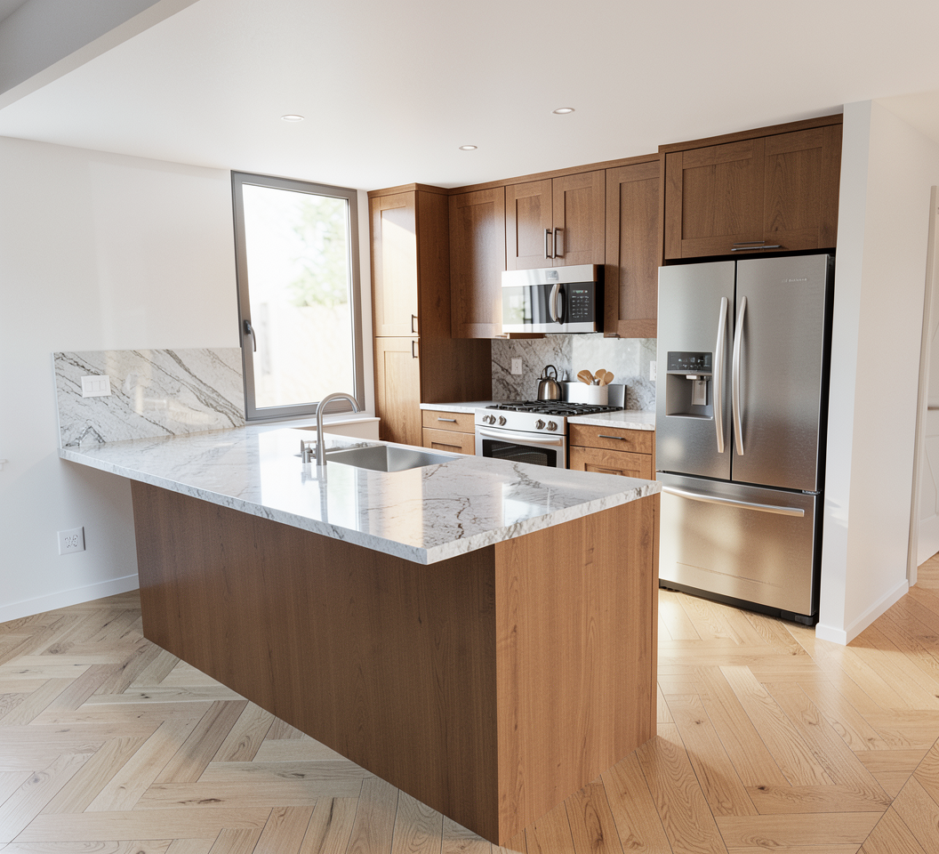 render this kitchen with 1 medium walnut cabinets with shaker style doors 2 stainless steel hardware fixtures and appliances 3 light oak narrow plank flooring 4 quartz countertop with light grey vein 5 quartz backsplash with light grey vein 6 walls painted flat white 7 wall base painted glossy white 8 window next to kitchen has two fixed glass lights 9 back side of island is sheetrock painted white with glossy white wall base