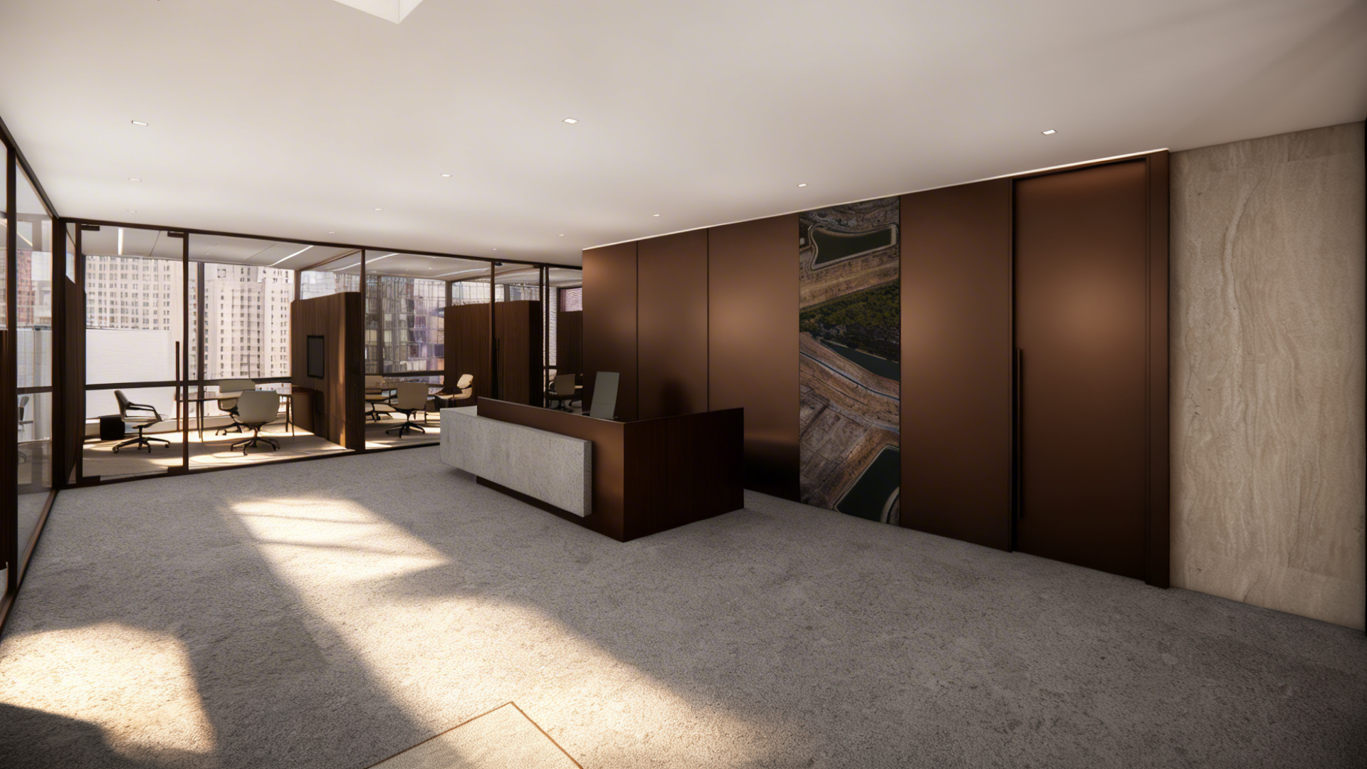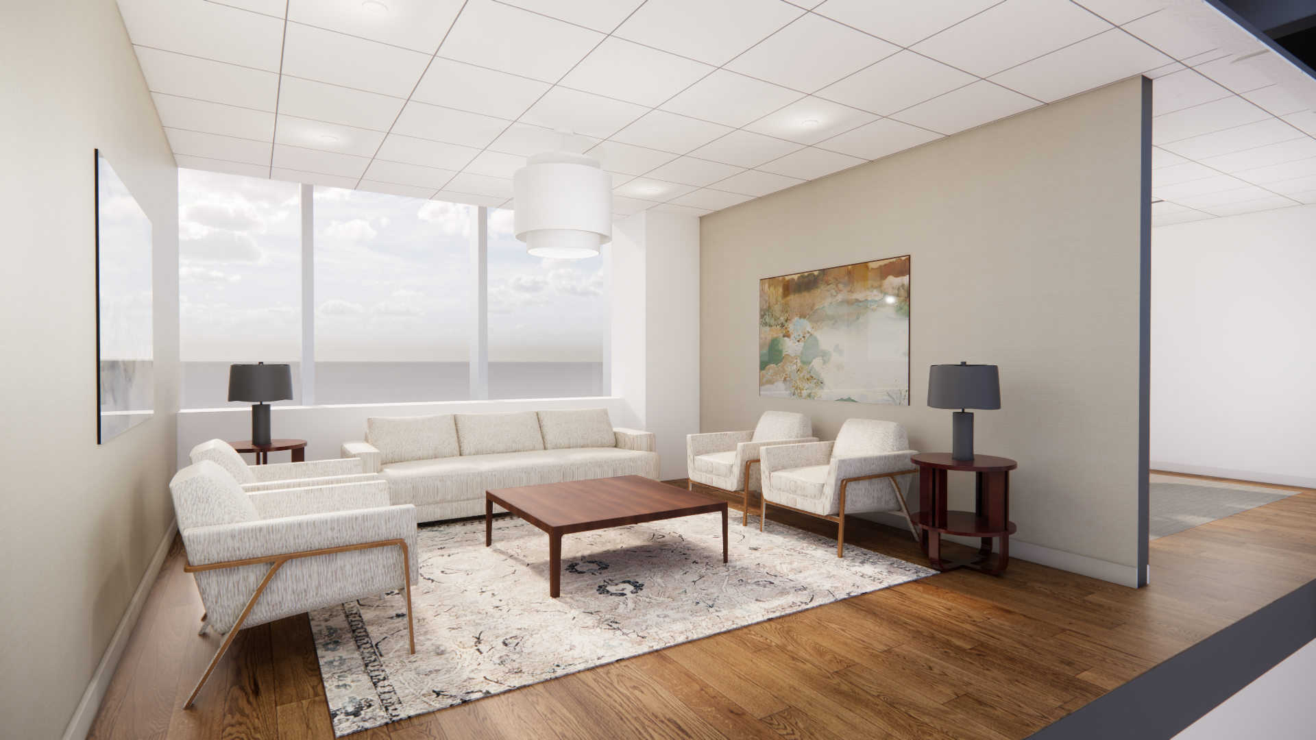 create a photorealistic rendering add midtown new york views from the 43rd floor preserve geometry materials and textures as they are change the color of the two table lamps to dark brown leather base and both linen color shade keep the shape change the fabric on the four existing chairs to soft dark blue and black metal frame change the ceiling pendant light fixture to light linen shades keep wall colors