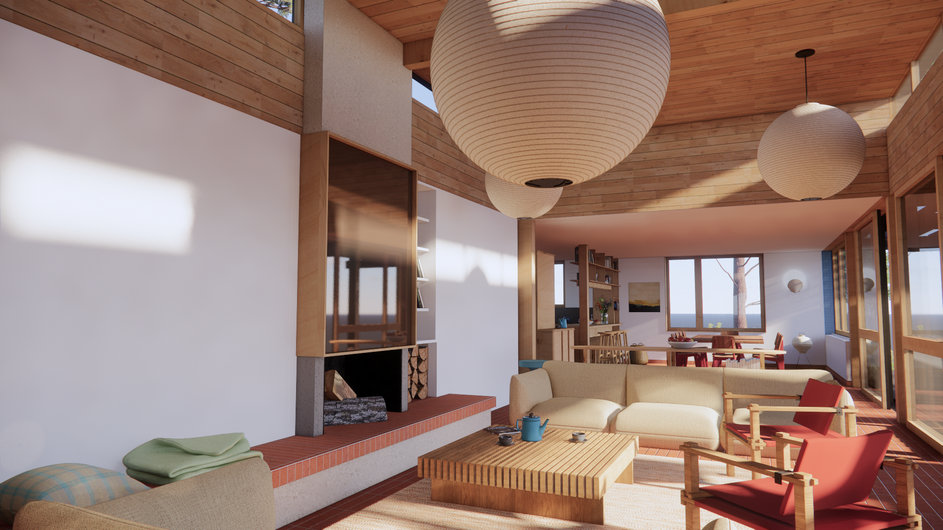 bright day time natural lighting soft shadows photography realisticslightly keep the volumes the geometrics the materials enhance materials and glass reflects pink bricks floor plaster walls wood ceiling mirror cheminy high quality render