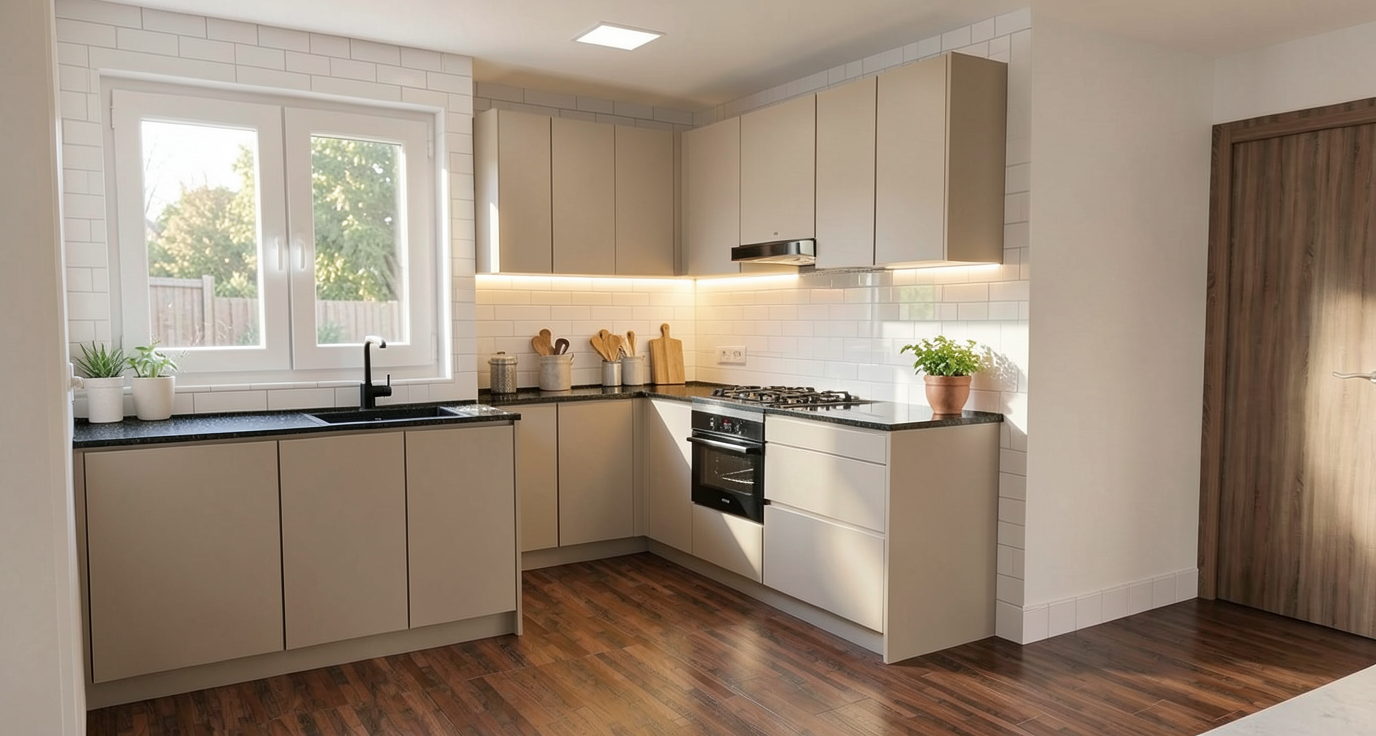 modern exterior shot create a high quality photorealistic render from a simple g 1 box type massing model strictly keep the original building shape proportions and openings unchanged do not redesign the structure only enhance materials and fa ade apply an ultra modern luxury theme use a controlled palette white textured plaster dark grey stone cladding and warm wood panels add large realistic aluminium framed windows with proper proportions not oversized or distorted provide a clean glass or metal balcony railing add subtle horizontal and vertical grooves to create depth enhance realism add a modern entrance door with a simple portal frame include soft landscape grass pathway minimal plants maintain realistic construction detailing no futuristic or impractical elements lighting and view use warm evening golden hour lighting with soft shadows eye level human perspective slight corner angle avoid overexposure avoid dramatic or unrealistic effects important keep design buildable and cost realistic do not add extra floors curves or complex shapes do not change massing only upgrade appearance architecture