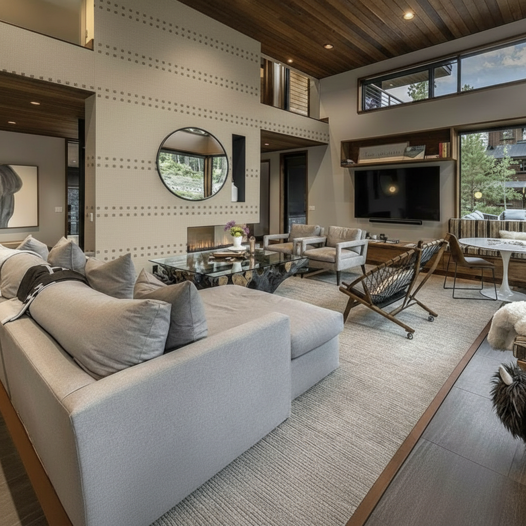 use the wallpaper in the reference photo to replace only the wallpaper on the wall with the big round mirror in the original photo