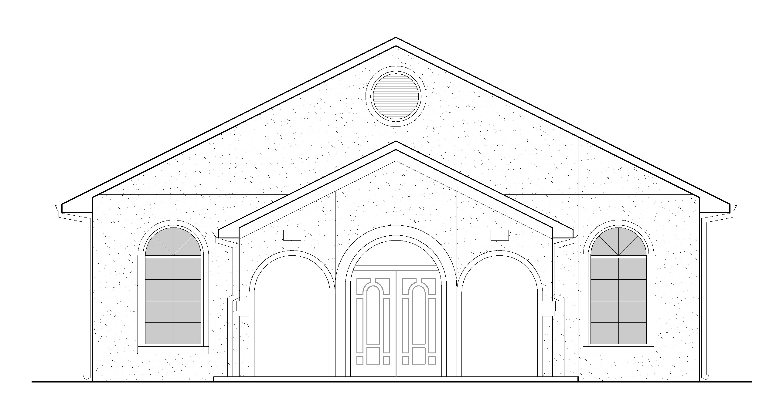 spanish style building with beige walls white trim and clay color roof set in front of a slightly wooded area