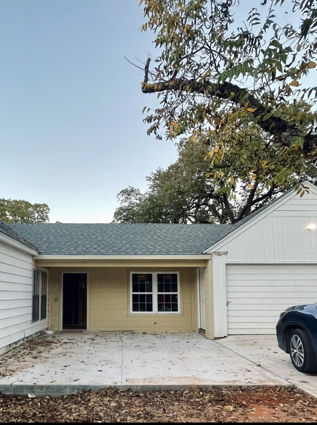 white siding pavers lots of plants rocking chairs to large vases with rosemary over casted day warm light fire pit wet drive way gas lamps