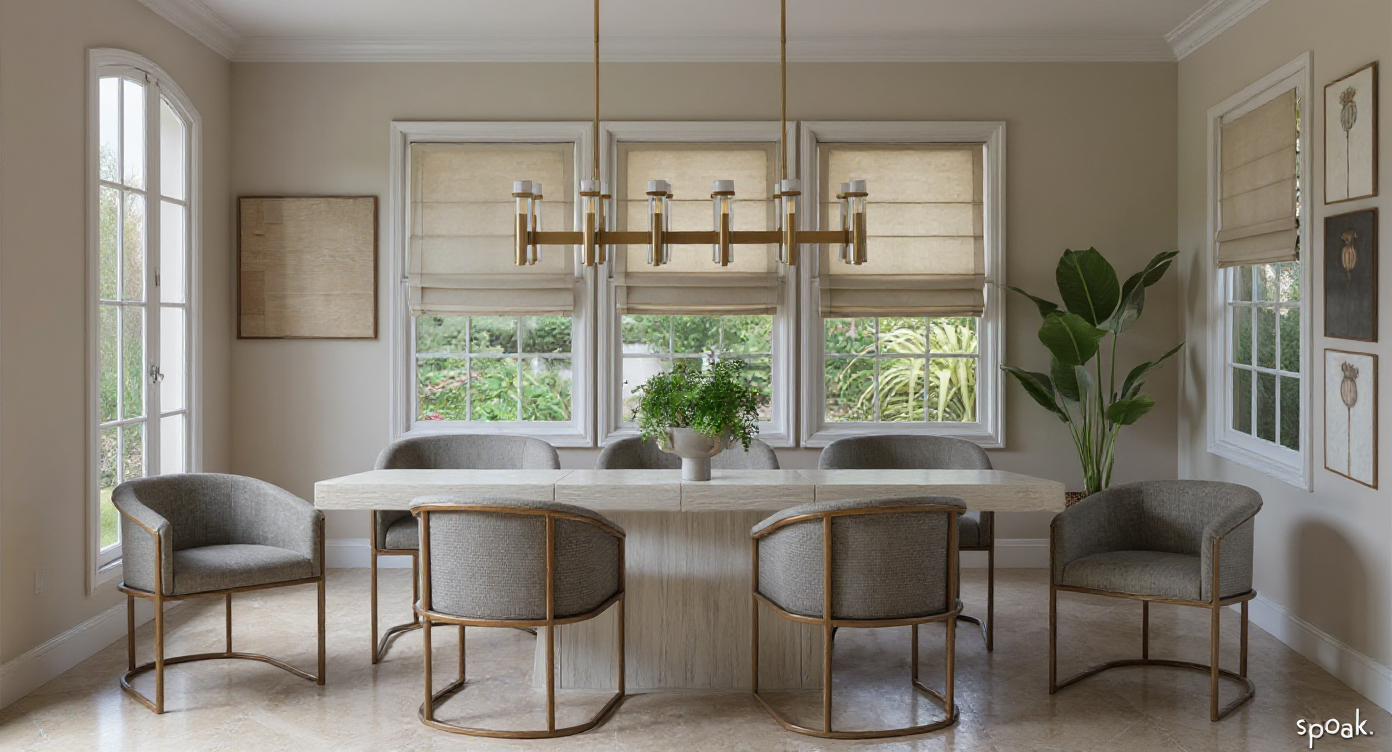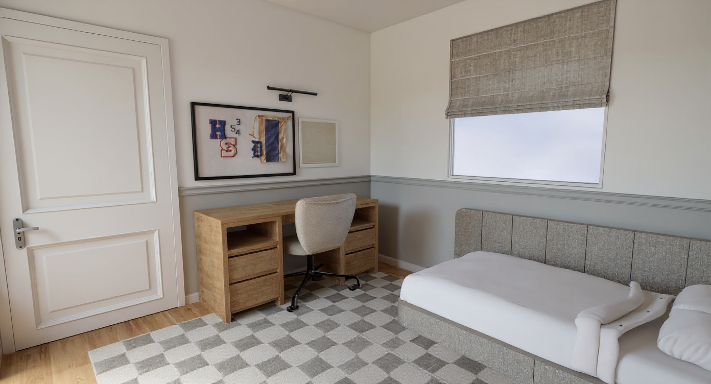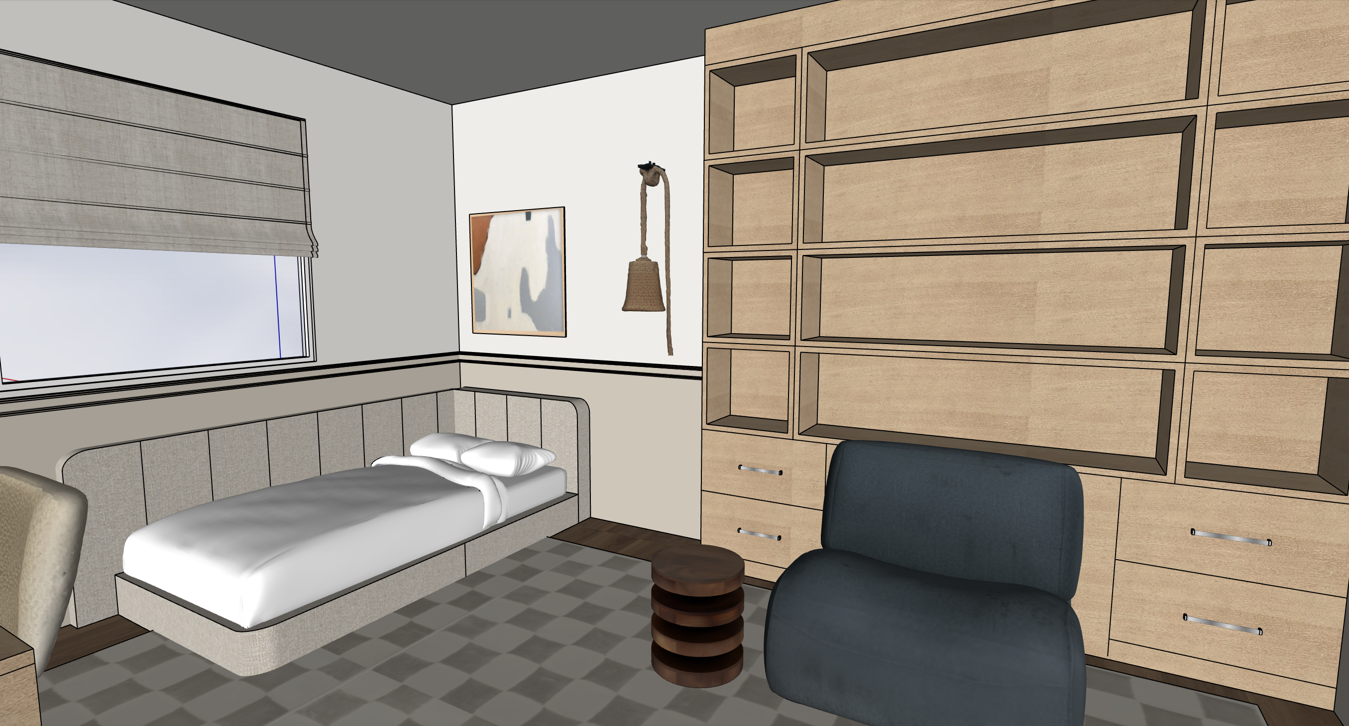 extra large checkered rug in grey and ivory the walls are split by a molding the molding and bottom half are light grey beige and the top is ivory