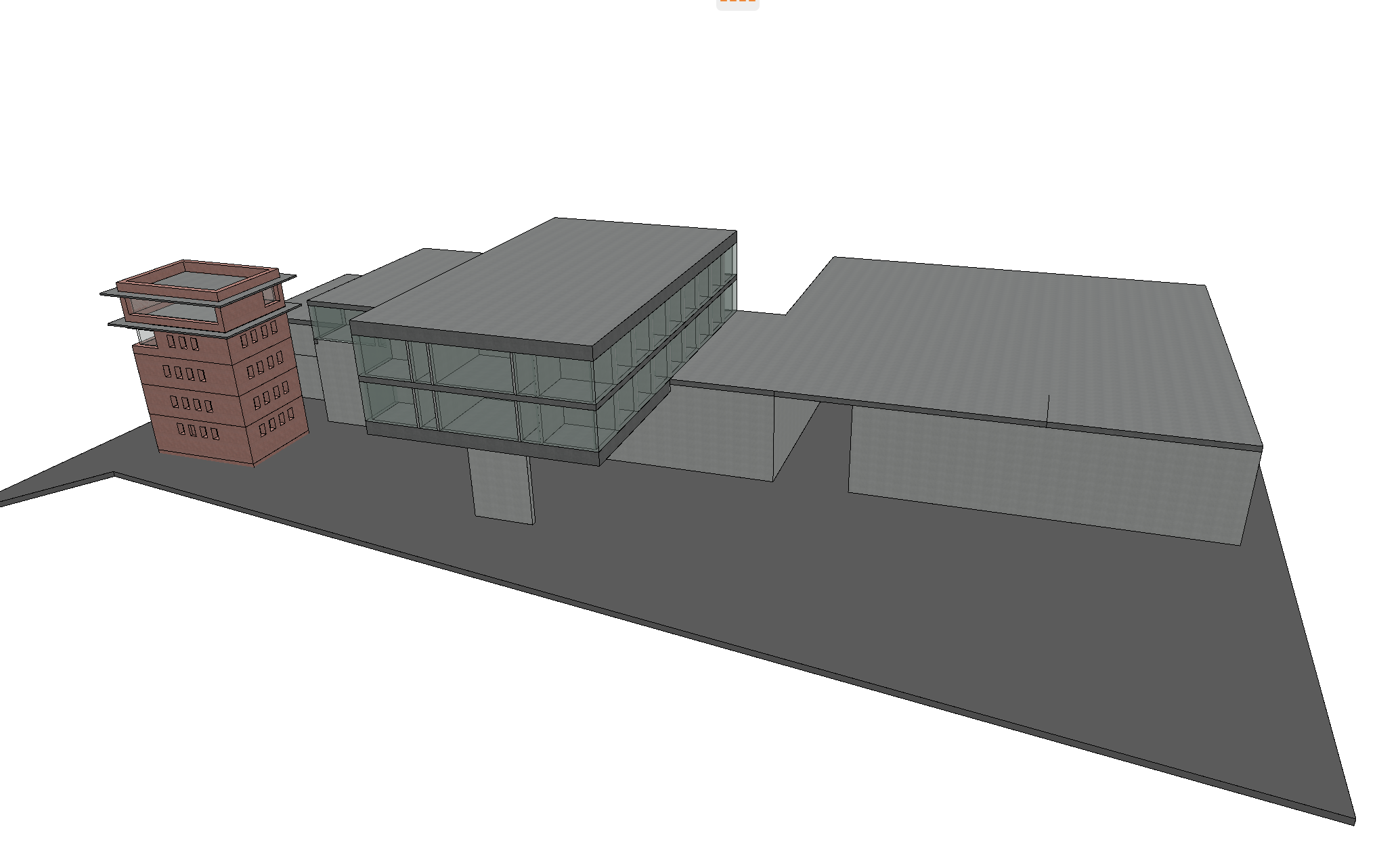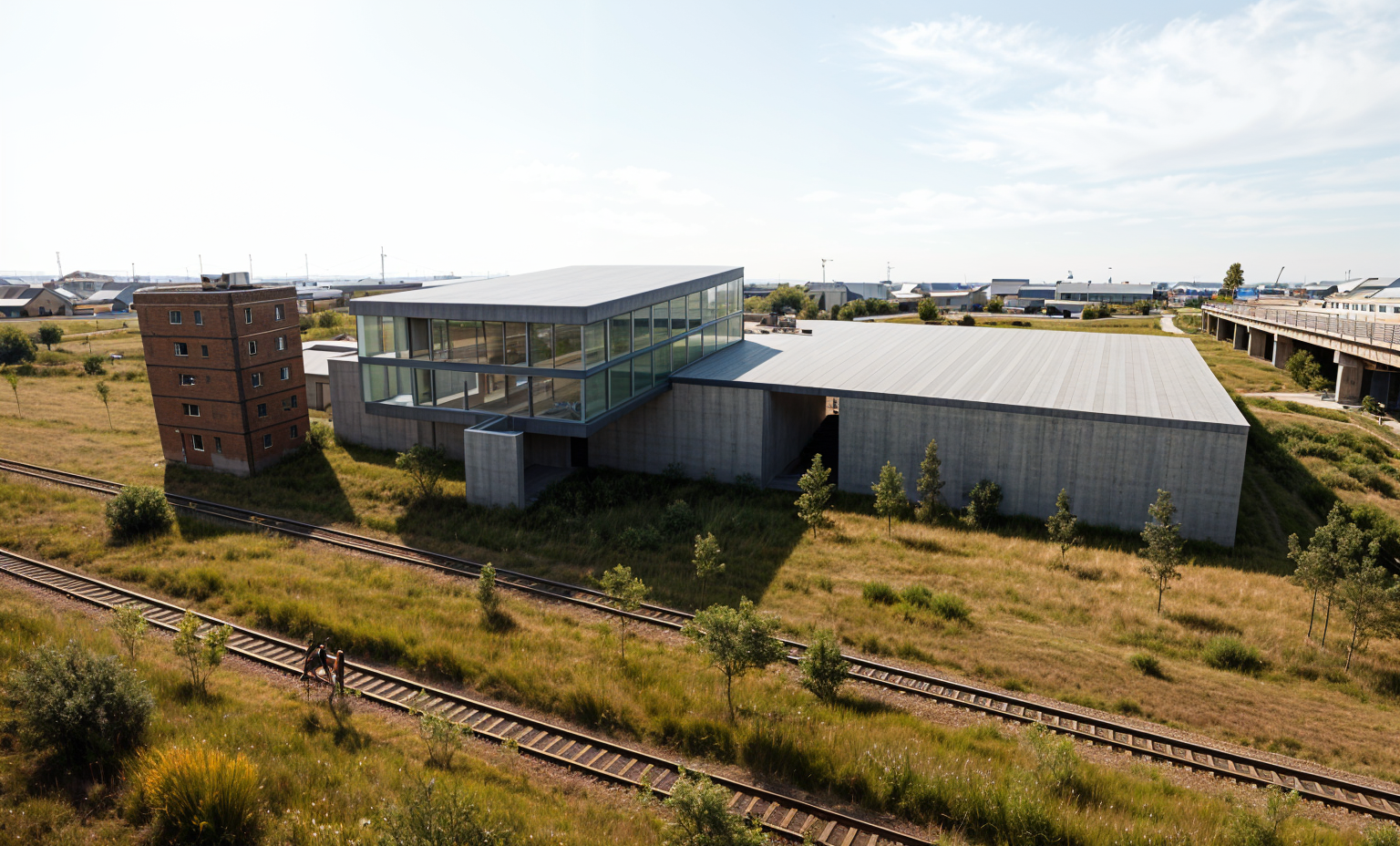 a realistic setting around the inserted buildings showing an open railway landscape with overgrown vegetation tall grasses small shrubs and scattered young trees the scene includes lightly industrial surroundings with a few low industrial buildings in the distance a raised road bridge on the right side and a bright clear sky with soft clouds the atmosphere feels open green and slightly rough shaped by railway terrain and natural vegetation blending into the industrial edges of berlin