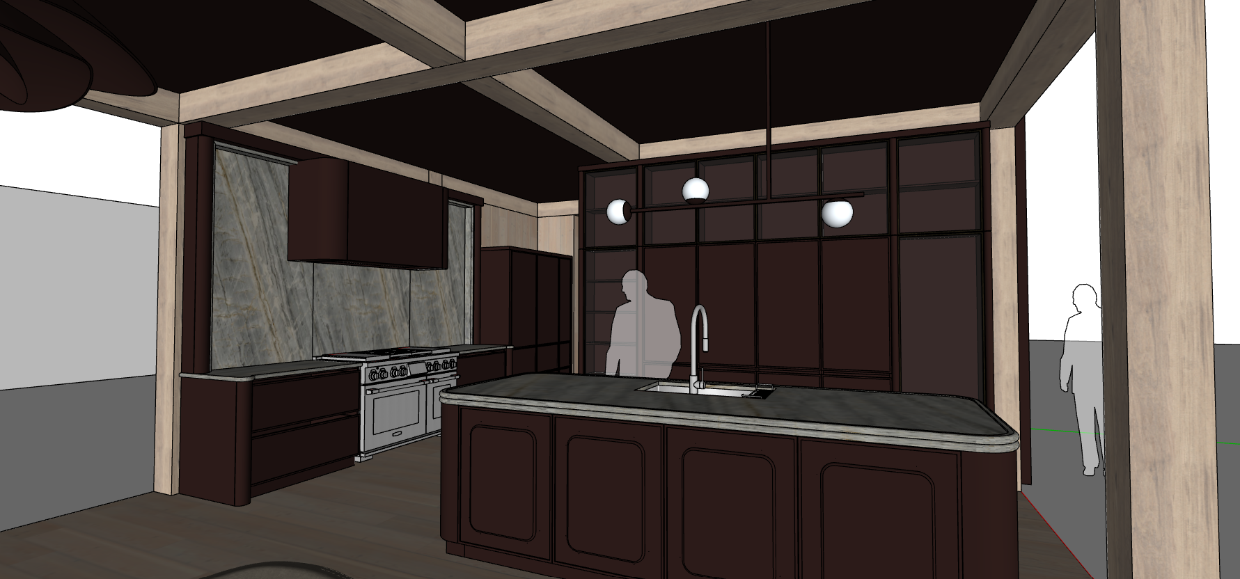 photorealistic render strictly based on the provided reference image of a tradeshow booth match geometry proportions layout and design exactly as shown do not add remove or reinterpret any elements open corner booth structure with flat roof and exposed vertical and horizontal beams in medium beige natural wood wood has a matte finish and subtle grain no color shift exterior and interior wall panels and all cabinetry in very dark red brown color ncs s 8010 y90r matte finish uniform tone cabinet doors are recessed panel style dark finish no added detailing cabinets doors that are see through have glass centers and the interiors of those cabinets are softly lit lighting replicated from the model pendant lights positioned exactly as shown neutral soft warm white light no dramatic lighting effects camera angle perspective and framing match the reference image as closely as possible background kept minimal and neutral no branding emphasis no stylistic enhancement render style clean realistic accurate material translation even lighting architectural feel