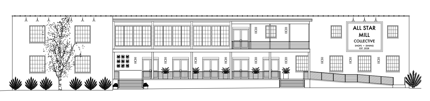 this is a red brick building black windows black aluminum storefront doors clear sunny day with a parking lot out front