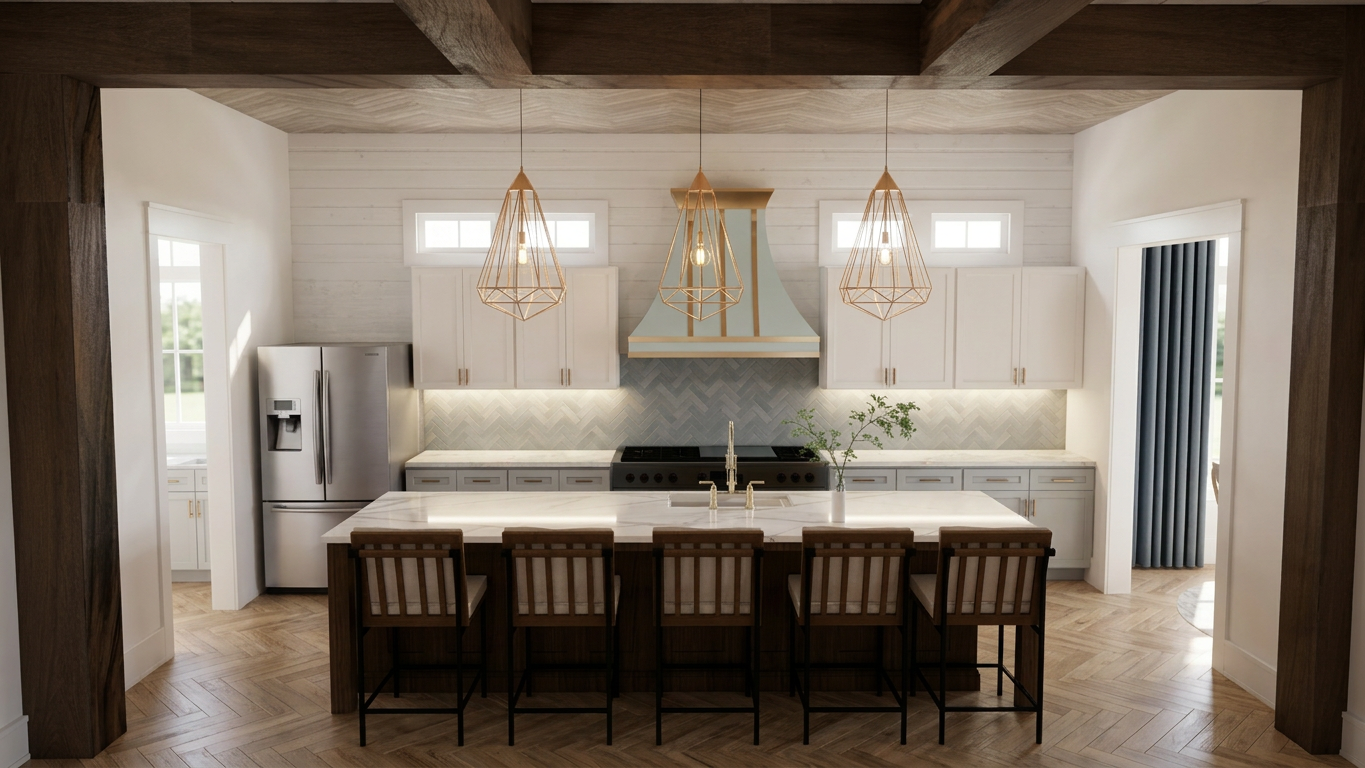 you are a professional image renderer you create the highest grade renderings around and specialize in architectural renderings this is an interior rendering of the luxury kitchen of a beach house create a high resolution photorealistic image of this room keep the windows as they are where they are keep the doors as they are where they are keep the main structure as it is where it is feel free to change the perspective keep the ceiling as it is where is it do not add anything to the structure that i have not asked for do not change the color of the vent hood add lighting in the foreground