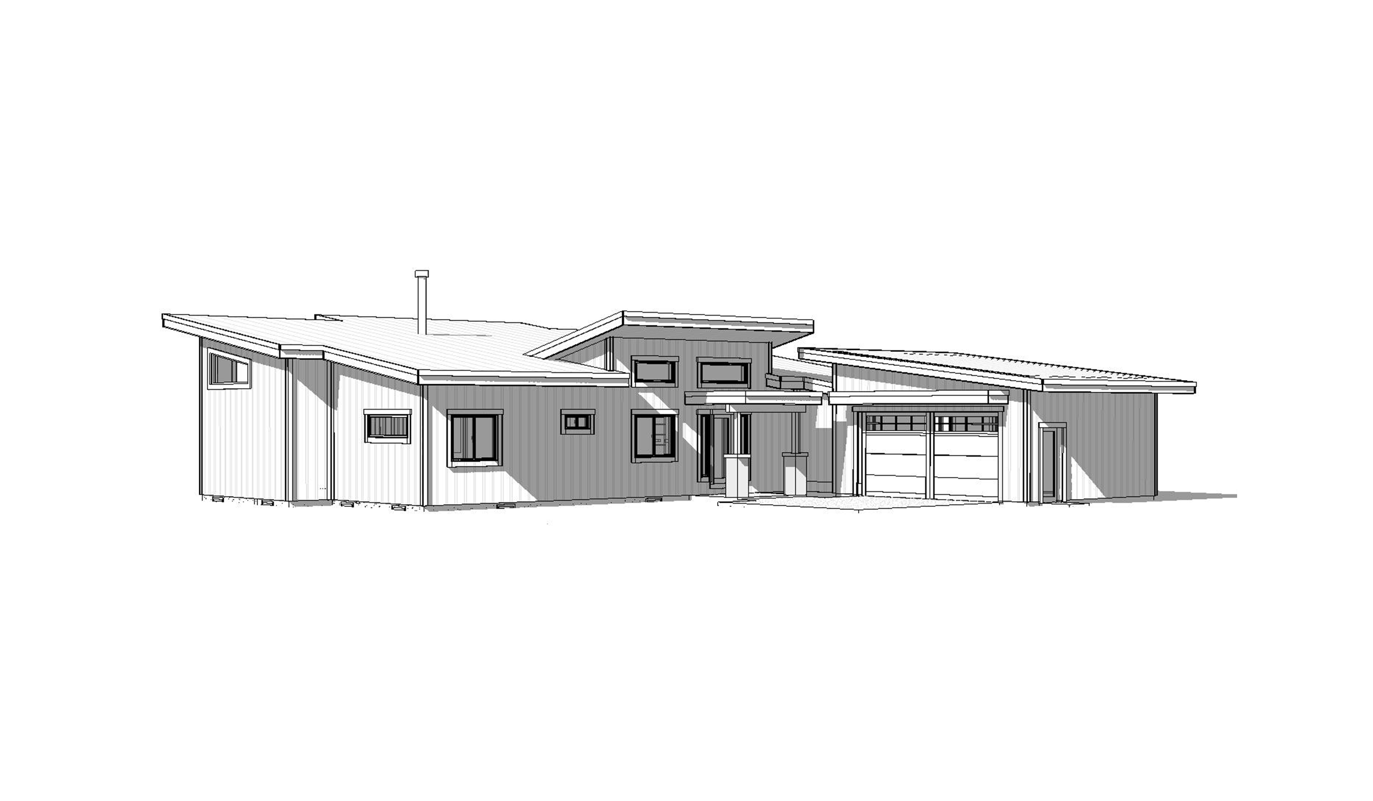 front view of a clean architectural exterior home rendered in cinematic golden hour lighting with bits of blue skies and sunlight coming through the faint clouds home in a mountain setting with faint streaks of light coming through trees in the surrounding area warm glow and mountain reflections off of the windows select grade vertical wood siding green manicured landscape around structure with gardens and patches of grass black standing seam metal roof prominent trees in the background high fidelity photorealistic visualization crisp shadow falloff refined facade geometry soft atmospheric depth premium architectural photography mood ultra clean composition and materials black window trim flat roof concrete driveway leading up to the black garage doors photorealistic render black window trim