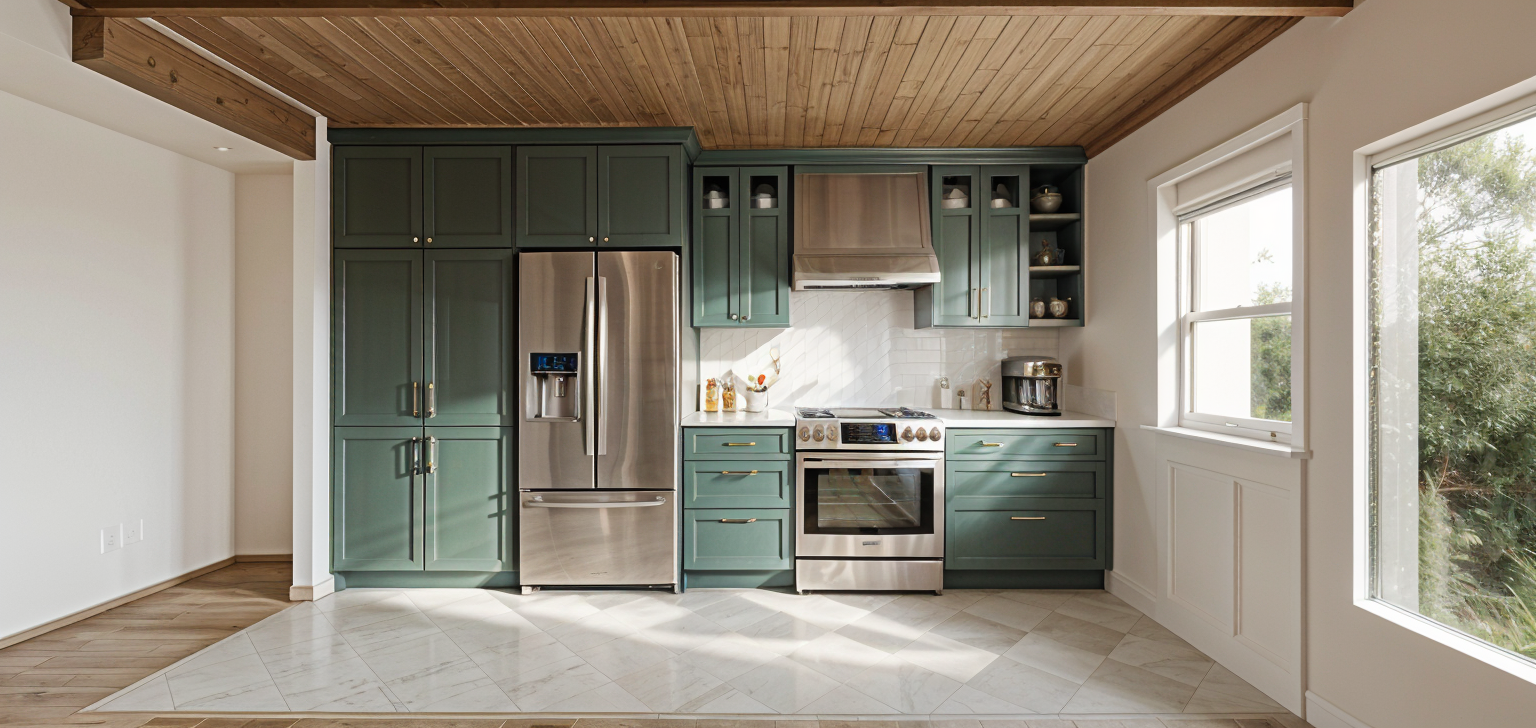 create a high end ultra photorealistic interior visualization based on the provided photo of an apartment in developer standard design a fully furnished open plan living space in mid century modern style layout dining area on the right side of the scene l shaped kitchen on the left side lounge corner with an l shaped sofa positioned in front of the dining table tv located behind the camera not visible in the frame design style mid century modern warm natural wood tones walnut veneer organic shapes slim tapered legs brass and black metal accents subtle retro references elegant simplicity timeless proportions materials and colors natural oak or walnut flooring wooden cabinetry stone or terrazzo kitchen countertop matte finishes warm neutral palette beige caramel olive muted orange warm gray soft fabric upholstery textured fabrics subtle patterns lighting soft natural daylight entering from windows warm ambient lighting decorative pendant lamps above dining table subtle indirect lighting in kitchen realistic global illumination soft shadows composition wide angle lens eye level perspective natural depth of field cinematic framing balanced composition realistic scale and proportions clean and harmonious layout quality ultra detailed photorealistic architectural visualization quality global illumination physically correct lighting high resolution sharp textures no distortion no noise premium interior design aesthetic atmosphere warm cozy elegant modern retro ambiance inviting and livable calm and refined mood