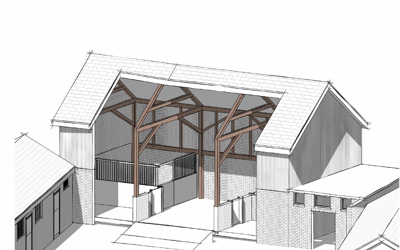 cut through of the barn to show the beams as a main feature timber columns beams trusses externally brick and timber cladding architecture