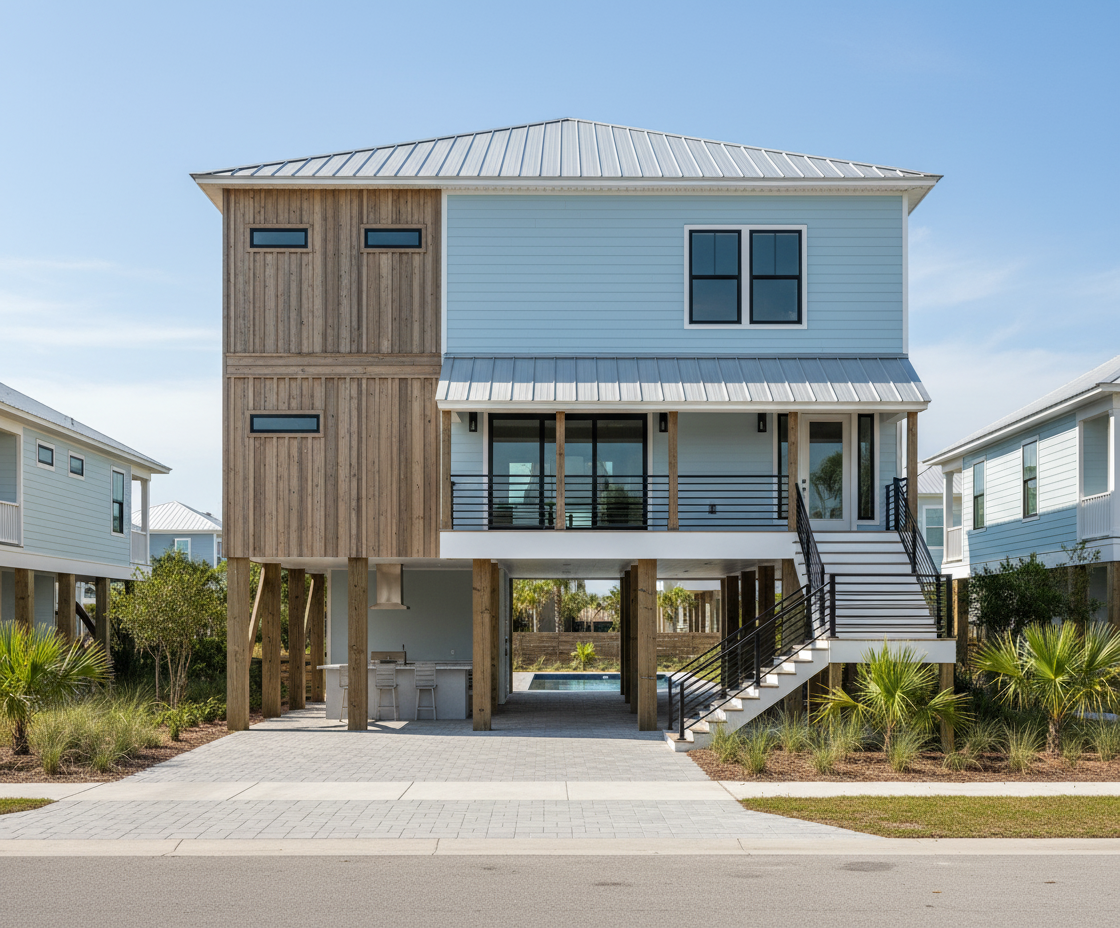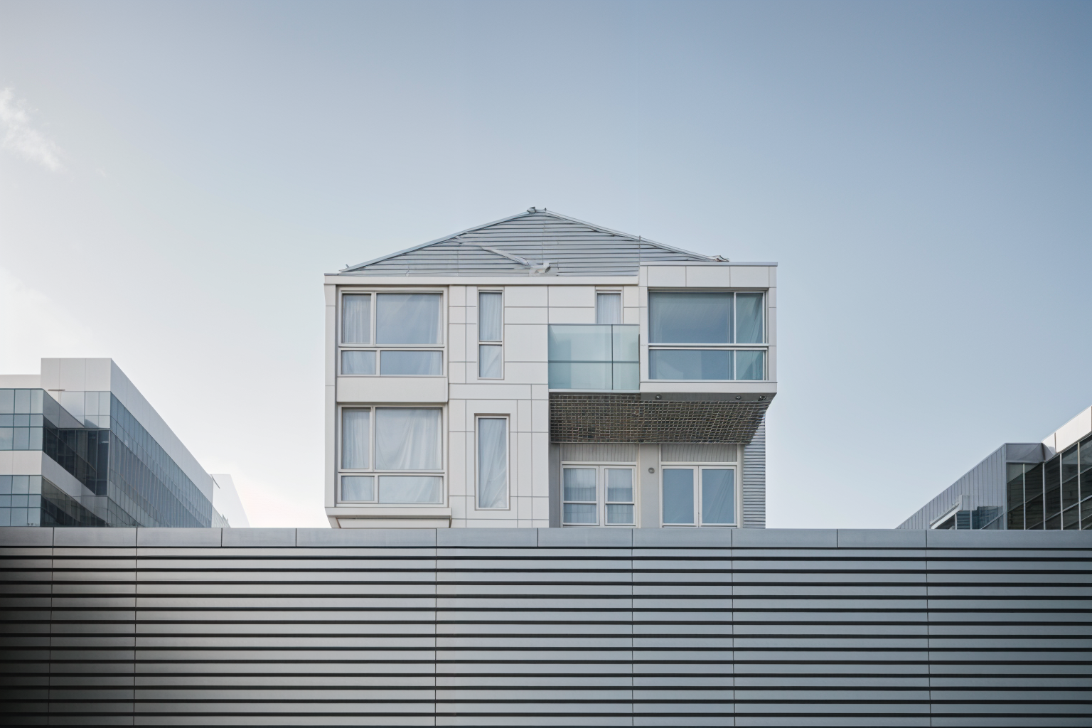 contemporary exterior shot modern minimalist house in a serene landscape featuring white wood siding stone accents in light gray and sleek black metal roof large windows reflect the radiant light surrounded by lush green grass the atmosphere is peaceful and inviting with a clear blue sky dotted with soft white clouds the surrounding trees are a vibrant green enhancing the tranquil setting architecture
