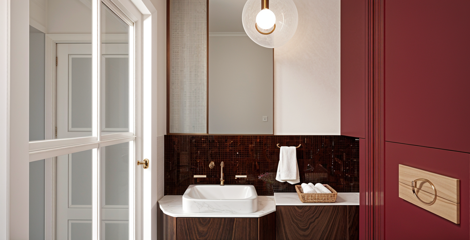 walnut cabinetry sage green wall color white marble countertop backsplash cream grey stone 12x12 tile