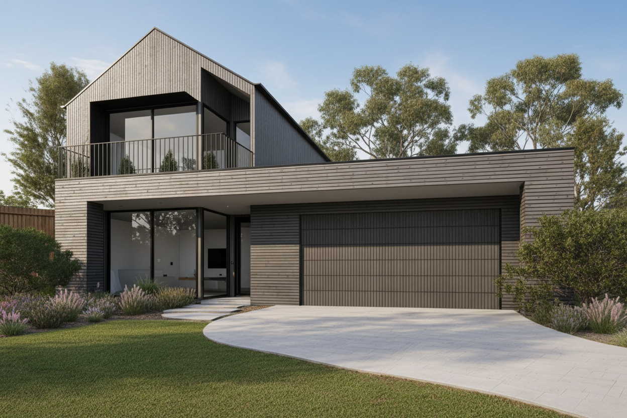 contemporary exterior shot use some dark stone walls at the proliferals some black wood panels and steel accents some walls in and orange washout paints creating strong contrast between warm and dark tones architecture