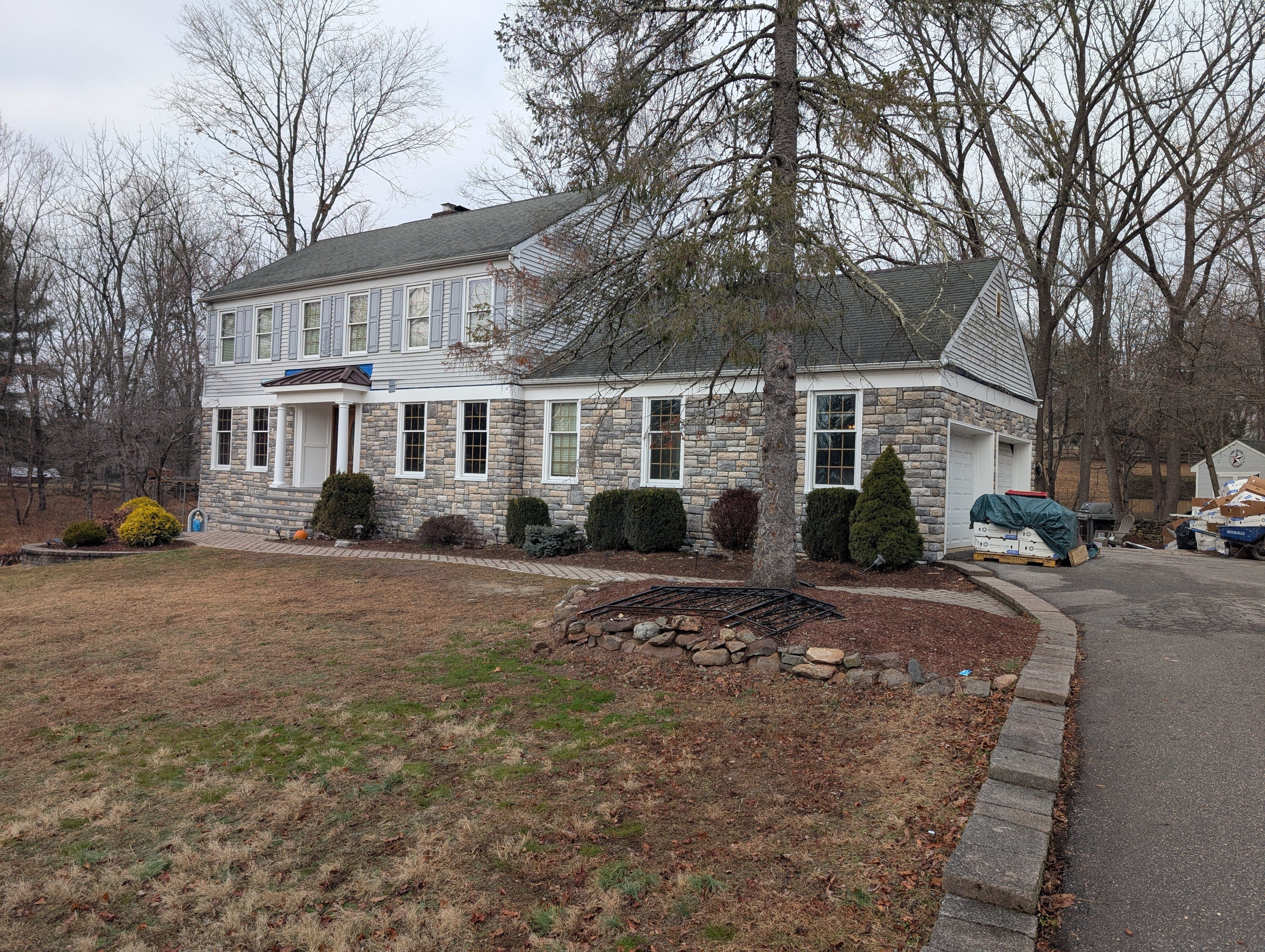 modify the upper horizonal siding to be flagstone color vinyl siding by certainteed modify the roof to be mission brown by gaf and show dark brown gutters and downspouts located where they would typically be except on the covered porch